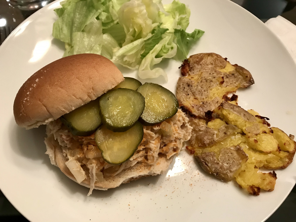 Still had a great taste. Slow cooker, shredded chicken, mix in the soup and crushed crackers. Serve with dill pickles. Side of smashed potatoes. I remember the original, older versions would have been paired with tater tots.