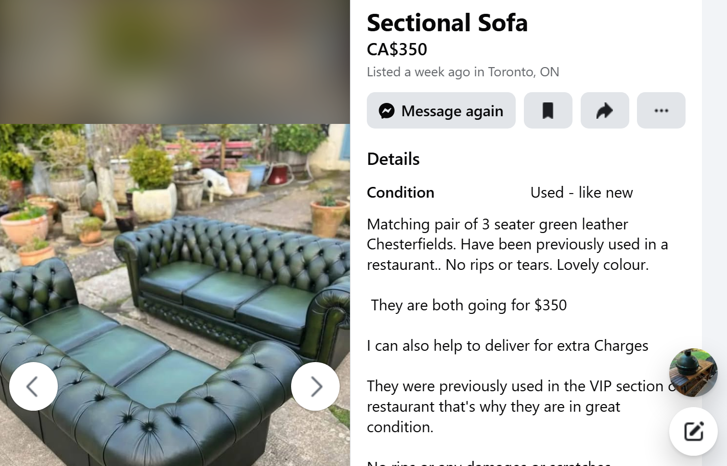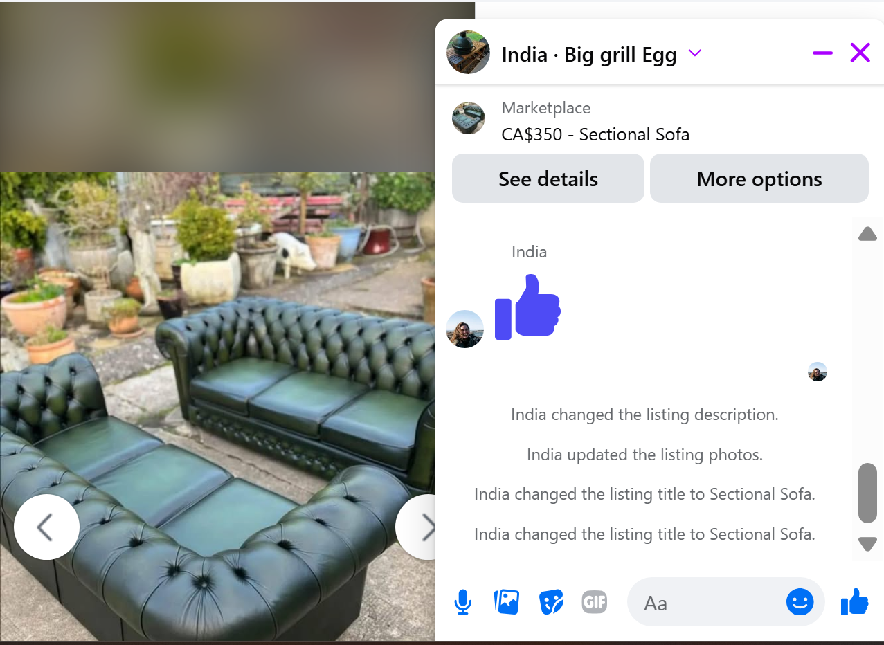 See the almost new Large Egg with table in the original 'bubble'? After sending a curious question to the seller I realised it was a scam. Couple of days later the seller changed the same ad to leather couches, also changed profile picture from a man to a woman. The price remained the same at $350. 😡