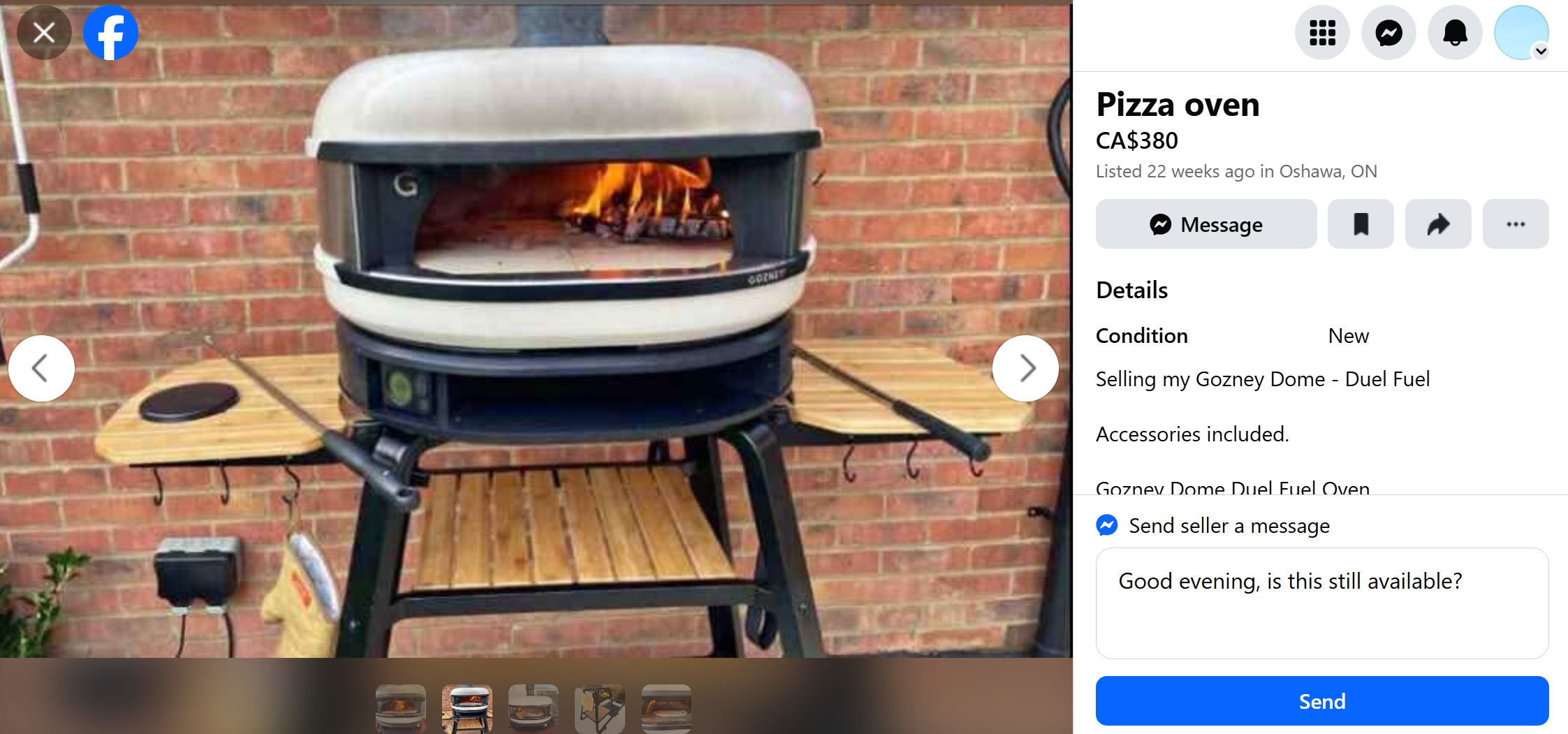 Not in the market for this but noticed a bunch of Gozney Dome scam ads in FB Marketplace here, too good to be true. Here's an example, advertised as New but pictures show oven in use. Their MO is send me etransfer so I can mark it sold and hold for you 😂