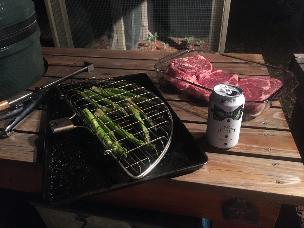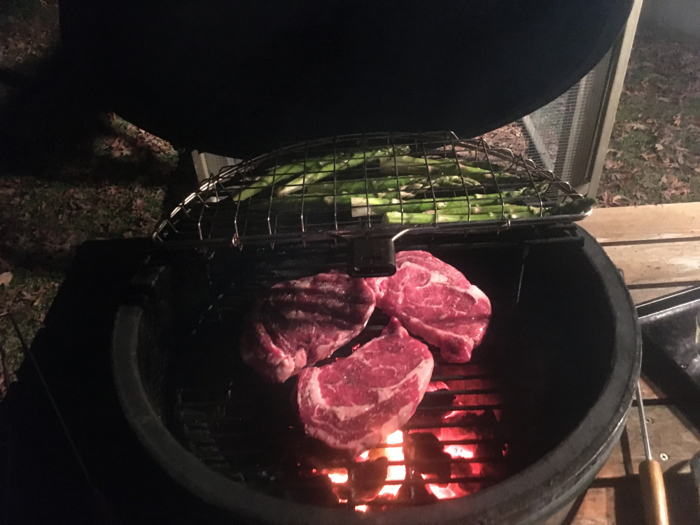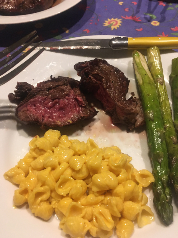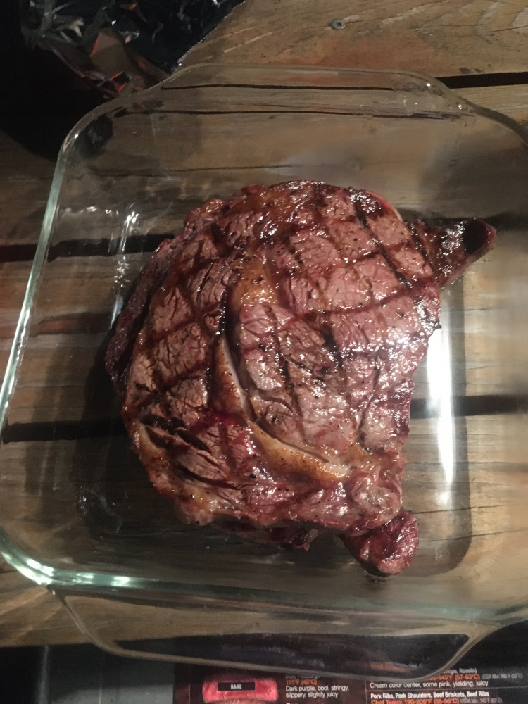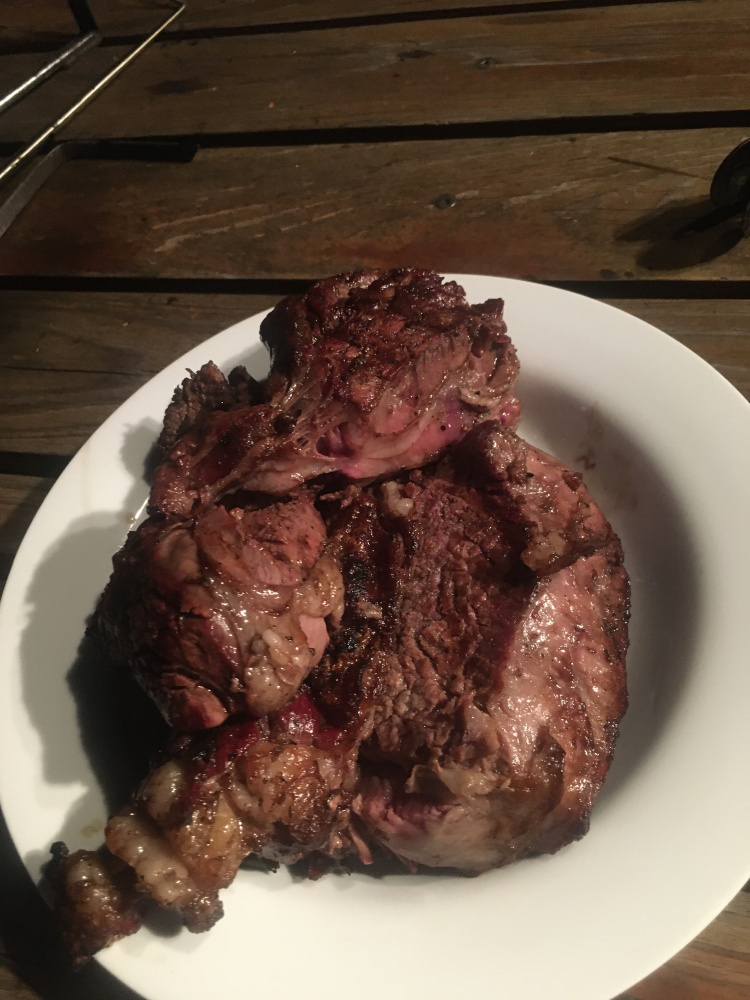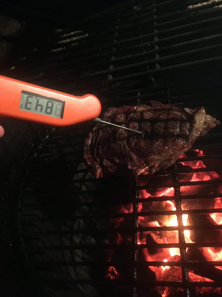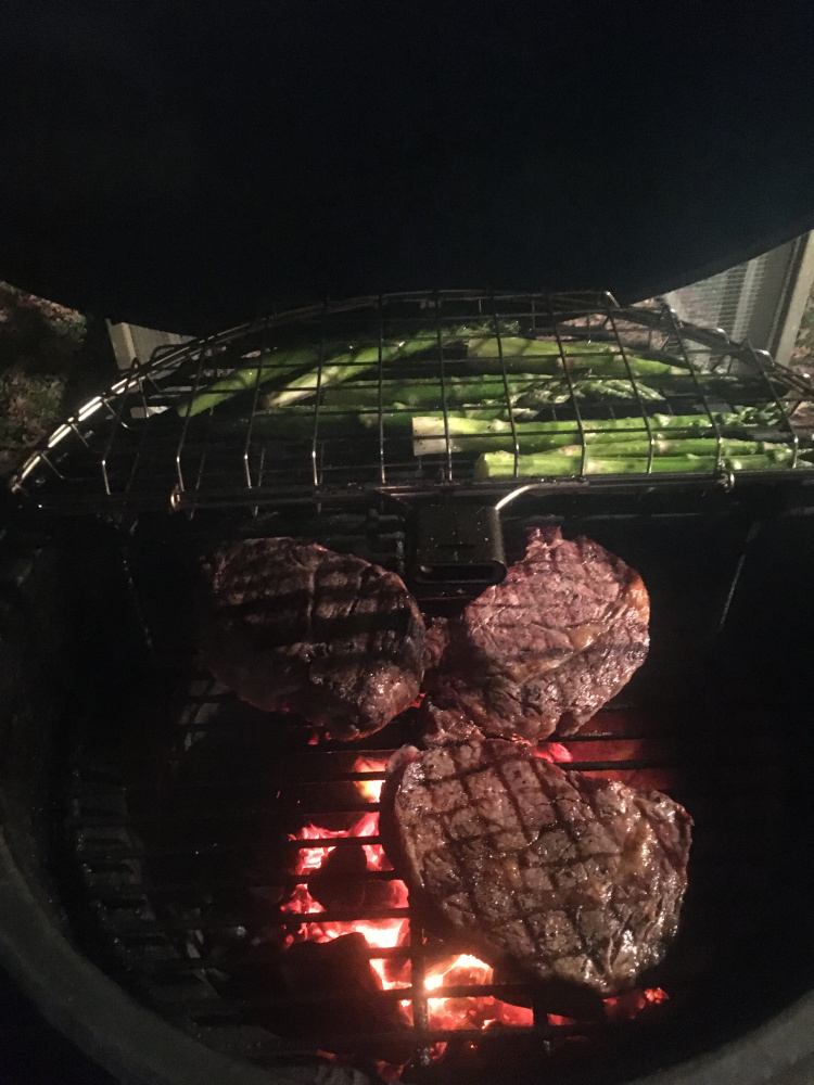 Around 500 temp. The thinner steaks were typical for the cross hatch and quick med rare to med. textbook results. The fat boy was a “covid free but no guarantee 84” after 10 min so it got butterflied. Instead of a real sharp big knife on a cutting board to butterfly on the fly like a pro with a dishwasher on standby, this was “a steak knife hack job without taking it off the grill and preserving my eyelashes.” It worked. Oh boy every bit was great.