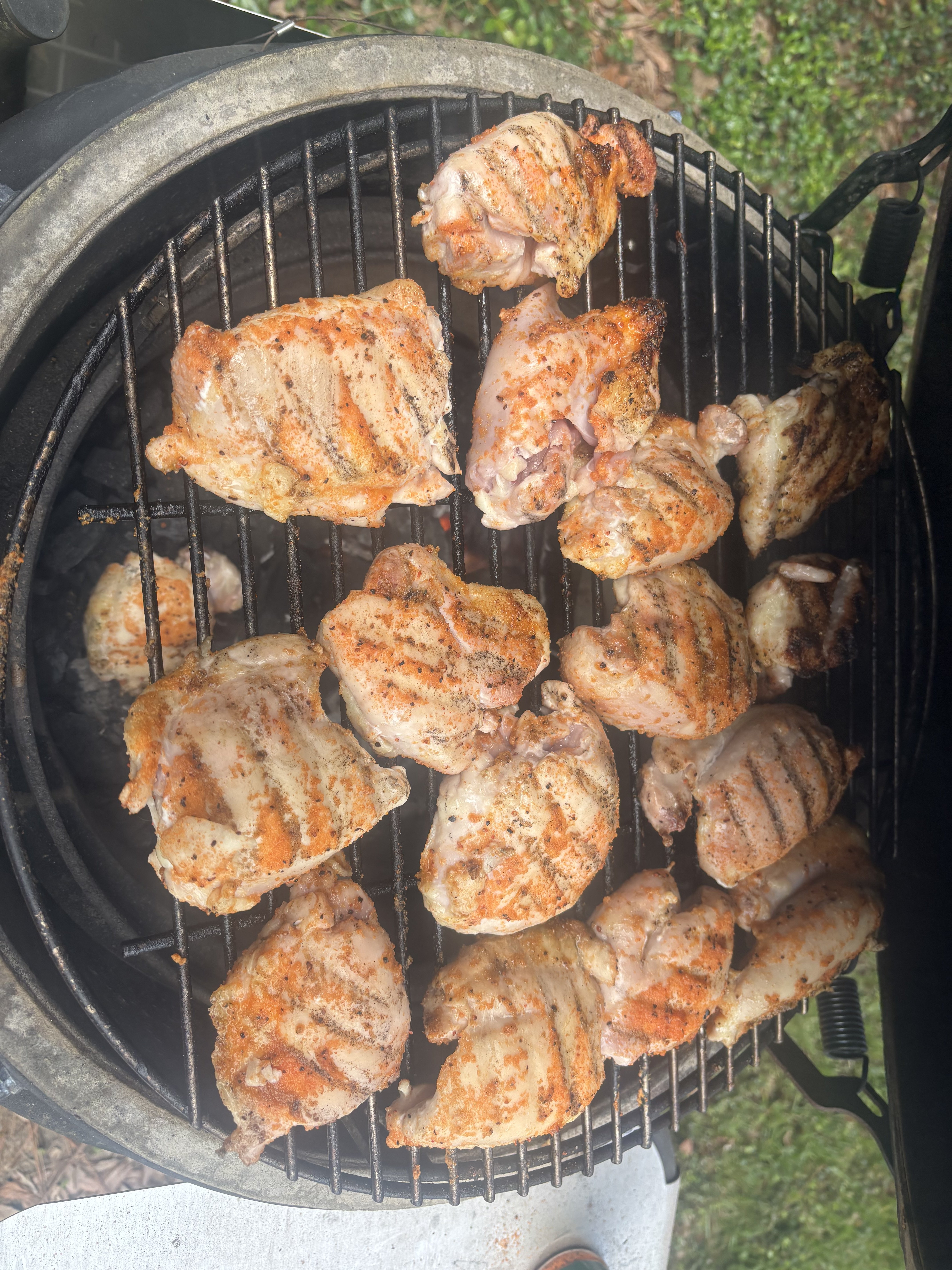 Making chicken tacos. My niece made an unscheduled trip back from overseas. Skinless boneless chicken thighs, Meatchurch Fajita rub, pickled onions, poblanos, cheese, corn or flour tortillas. As you can see we are one man down.