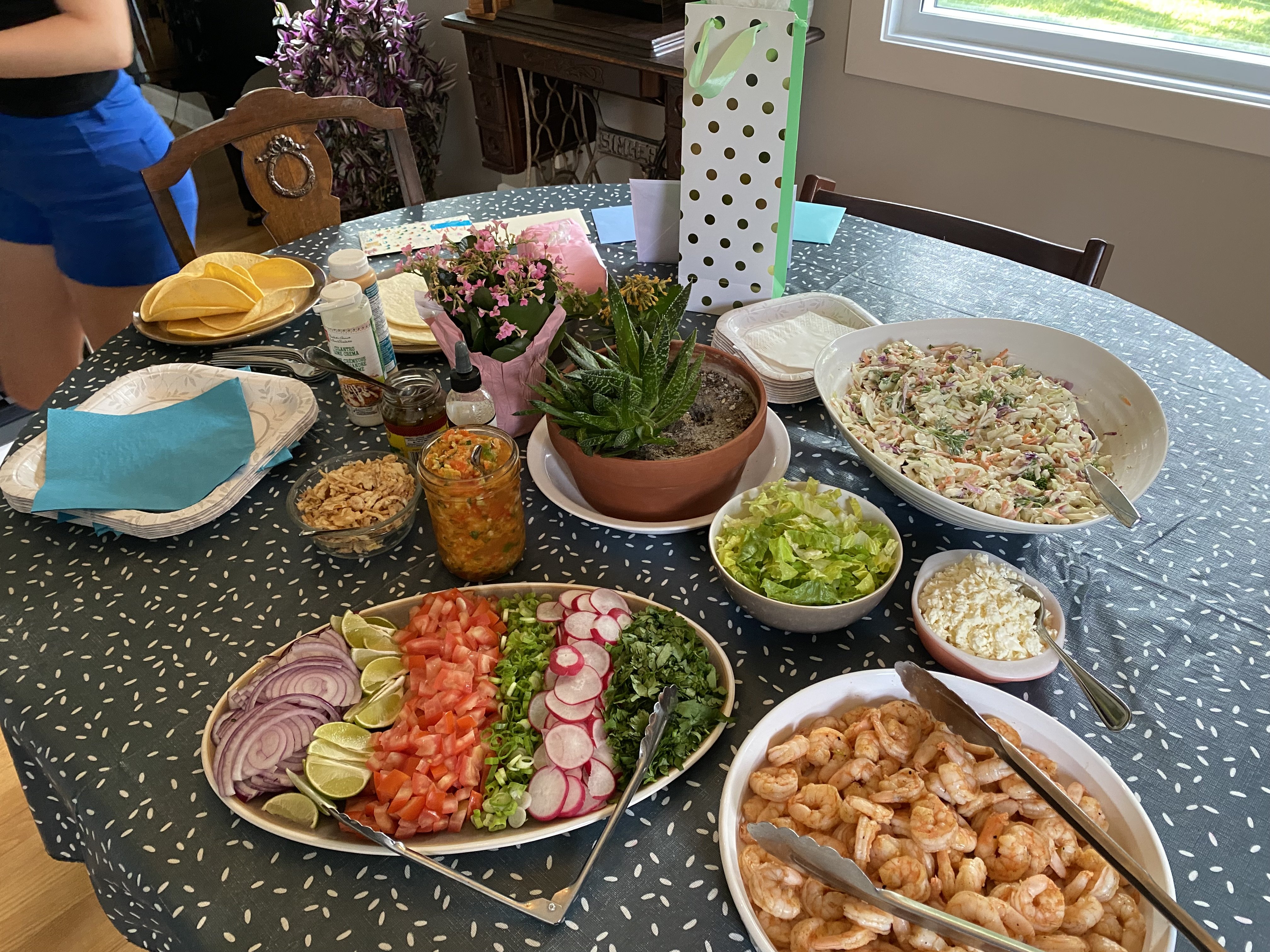 We had an over abundance of food. But a shortage of people: 2 cases of ear infections, one case of raging shingles, one went to wrestling, one isolating himself from sick people before this Thursday’s triple bypass. I had added red and green salsas (store bought), and lettuce for the celiac ones taco shell replacement. The pickled onions were a hit and relatively easy to make. Next time I will make a larger batch and hot bath seal the jars. Since the only liquid was red wine vinegar they should keep on the shelf.