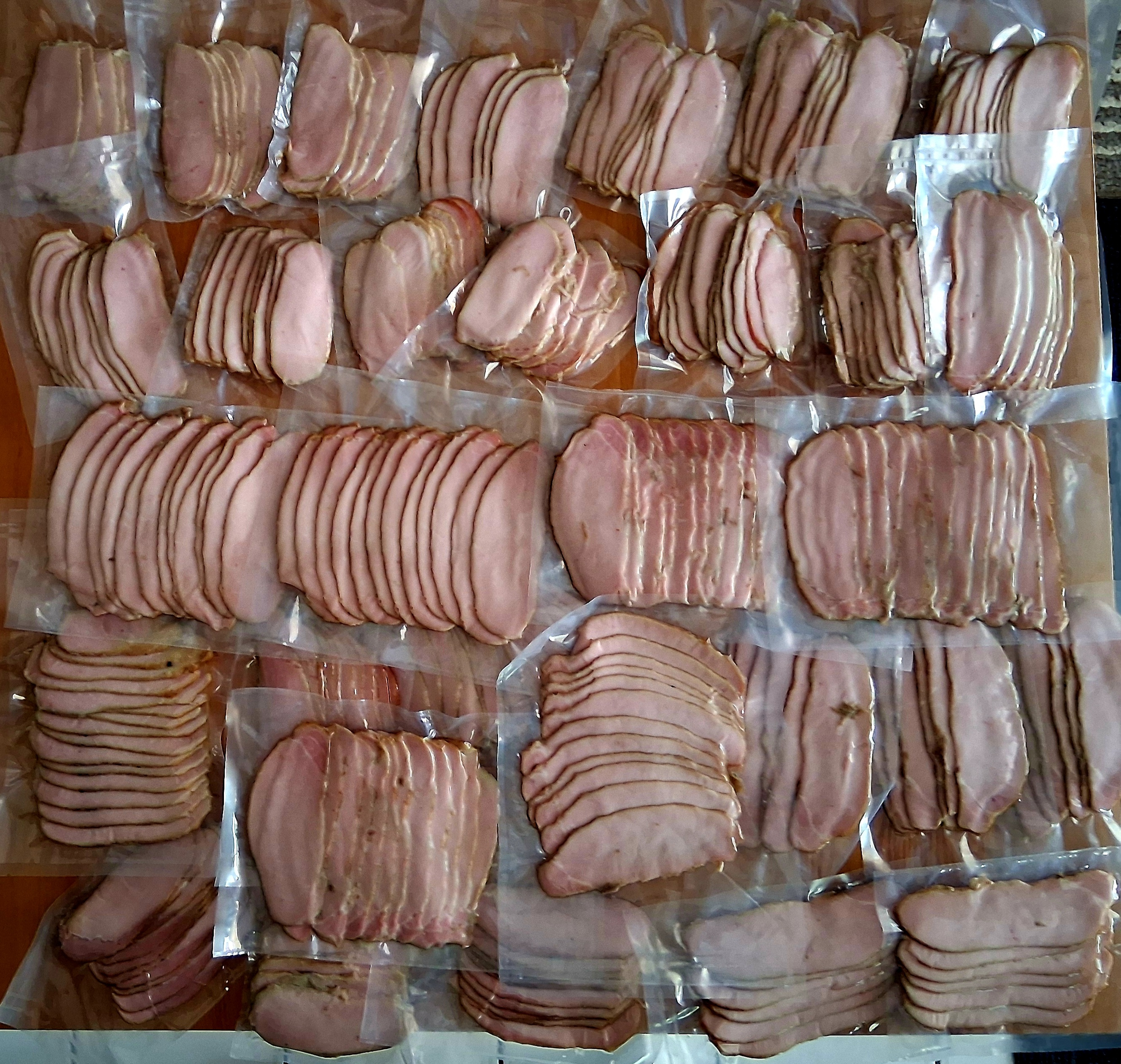 @GrateEggspectations Haha about 5 KG pre smoke, many will be given away. They are packaged in assorted sizes ranging from 80g to 200g, freeze well for at least a year since they are chamber sealed. Super handy for sandwiches, ramen, salad toppings, fried rice, omelets, wraps, breakfast with eggs, etc. Almost the same amount of work whether I smoke one loin or four so why not?
