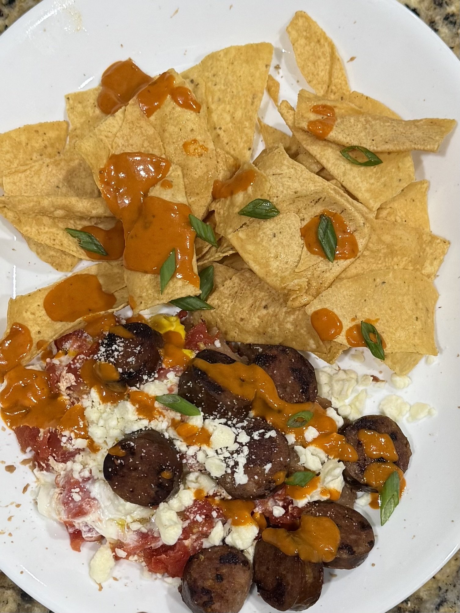 Needed an easy dinner so made huevos rancheros with some andouille sausage. Cooked the sausage, removed from the pan and reduced a can of Rotel spicy tomatoes and poached the eggs in the reduction, put that on top of some refried beans, then everything was topped with queso fresco, sliced green onion, and a chipotle cream salsa.