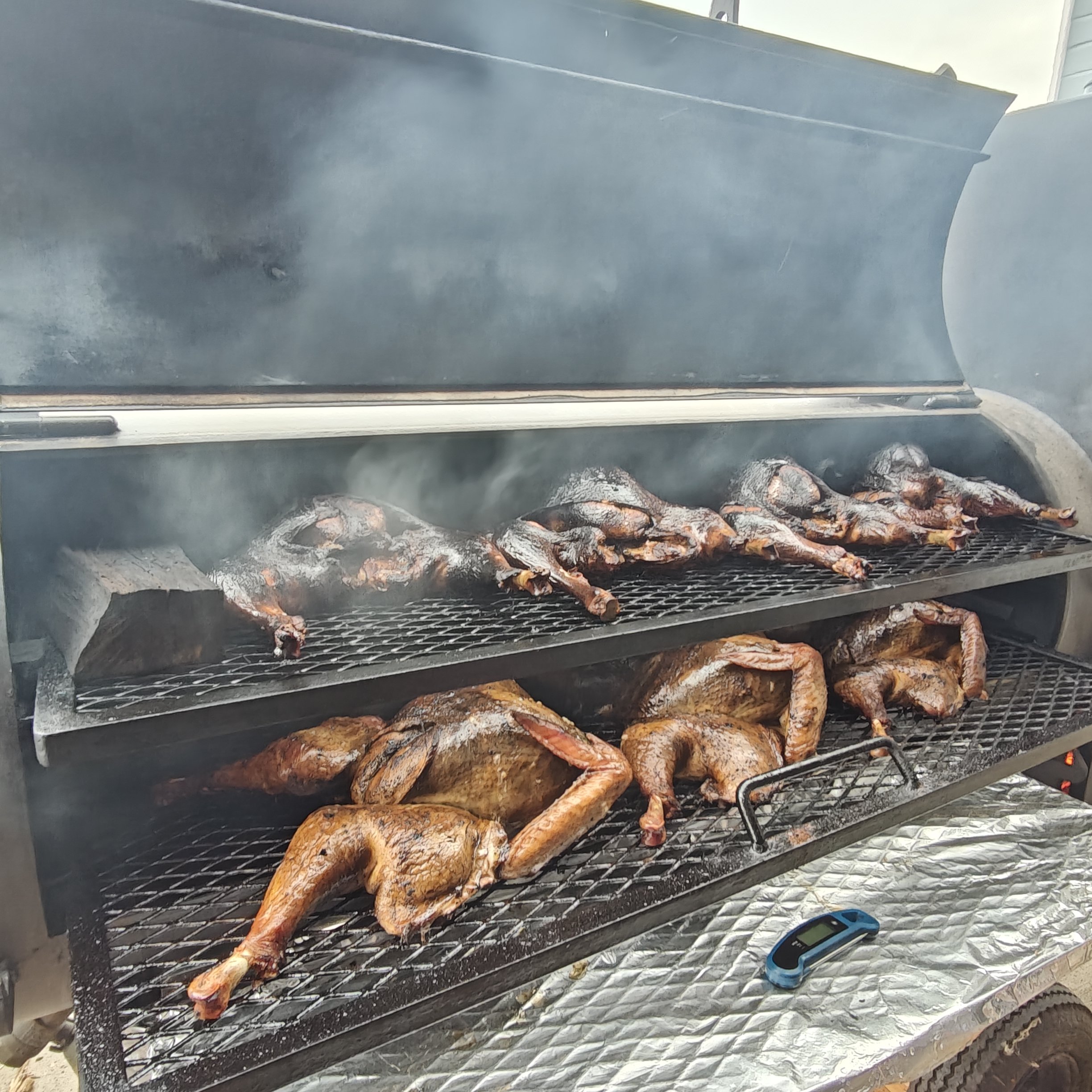 14 hour maple bourbon brine. Butter and maple syrup binder. Texas sugar rub. Almost done, sitting at 155 in the breast -