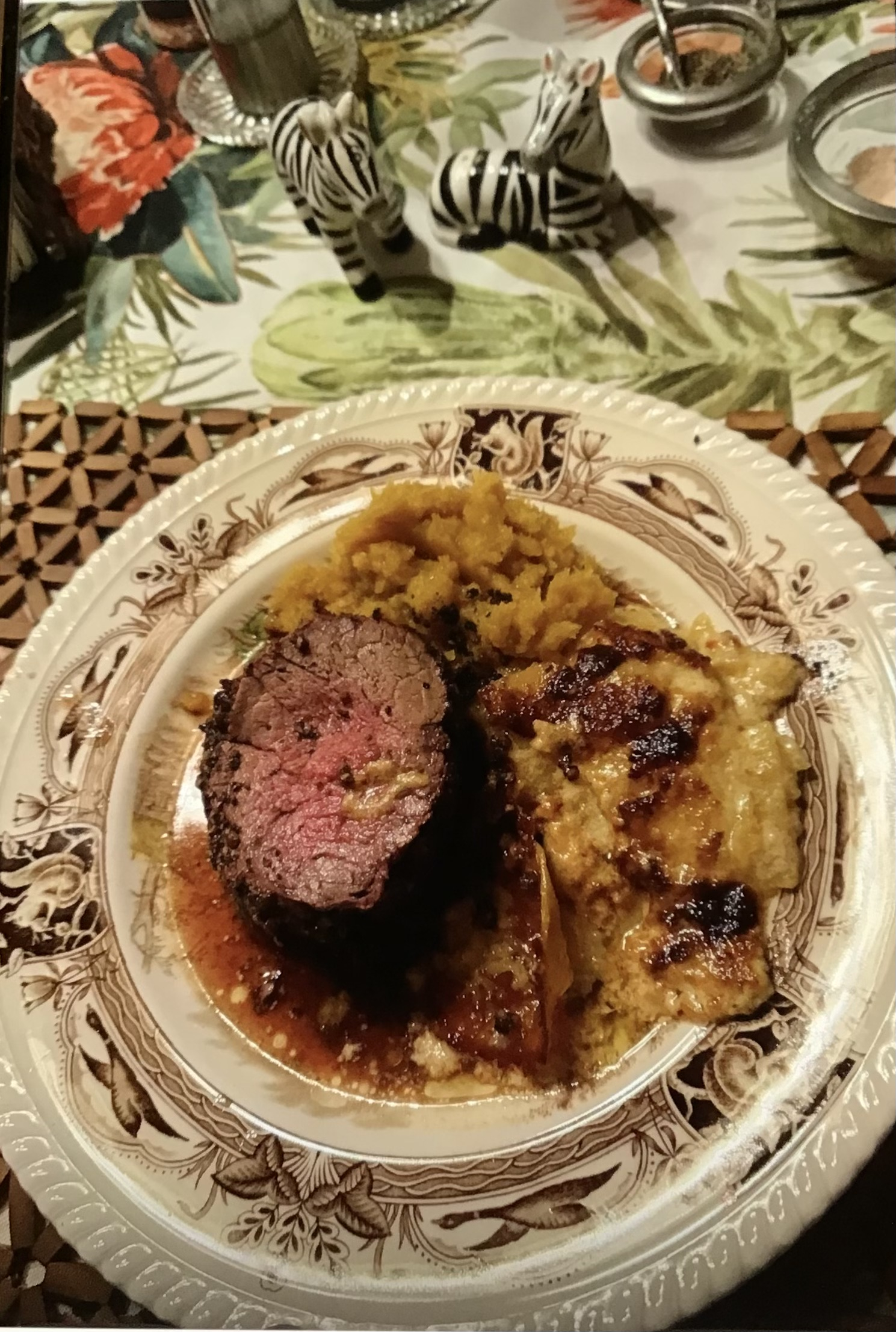 Also went with steak this year. Whole fillet of beef with a peppercorn crust served with scalloped potatoes, maple syrup acorn squash.