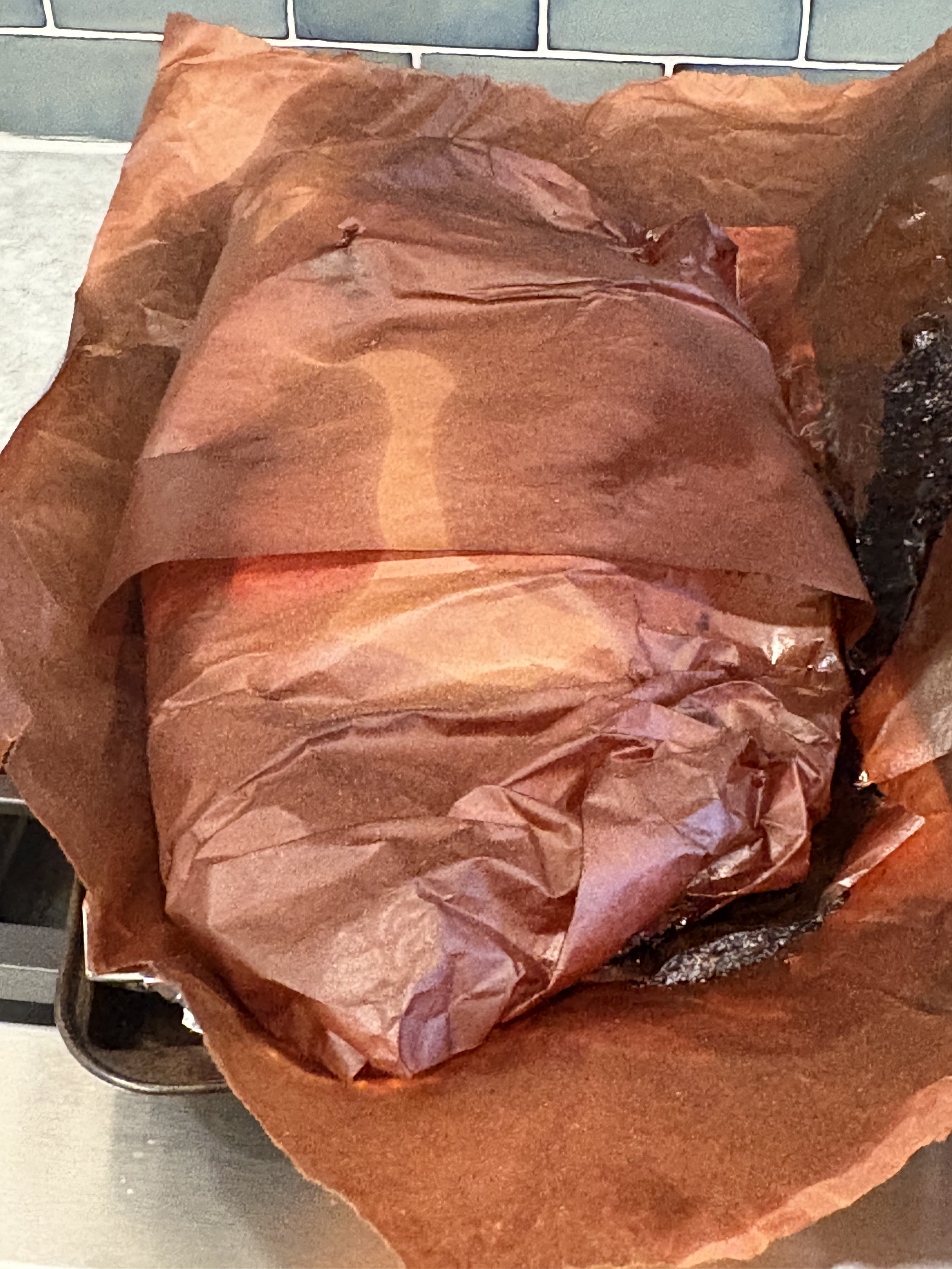 A weak picture of a stuffed pork 🐖loin ( 4lbs before loading up with pesto, provolone and prosciutto) just delivered to the small staffed fire house. No $$ shot. Smelled great. Hope no one chokes on all the twine to assemble that thing. Pan interior length around 11.5" or 30 cms for reference.)
