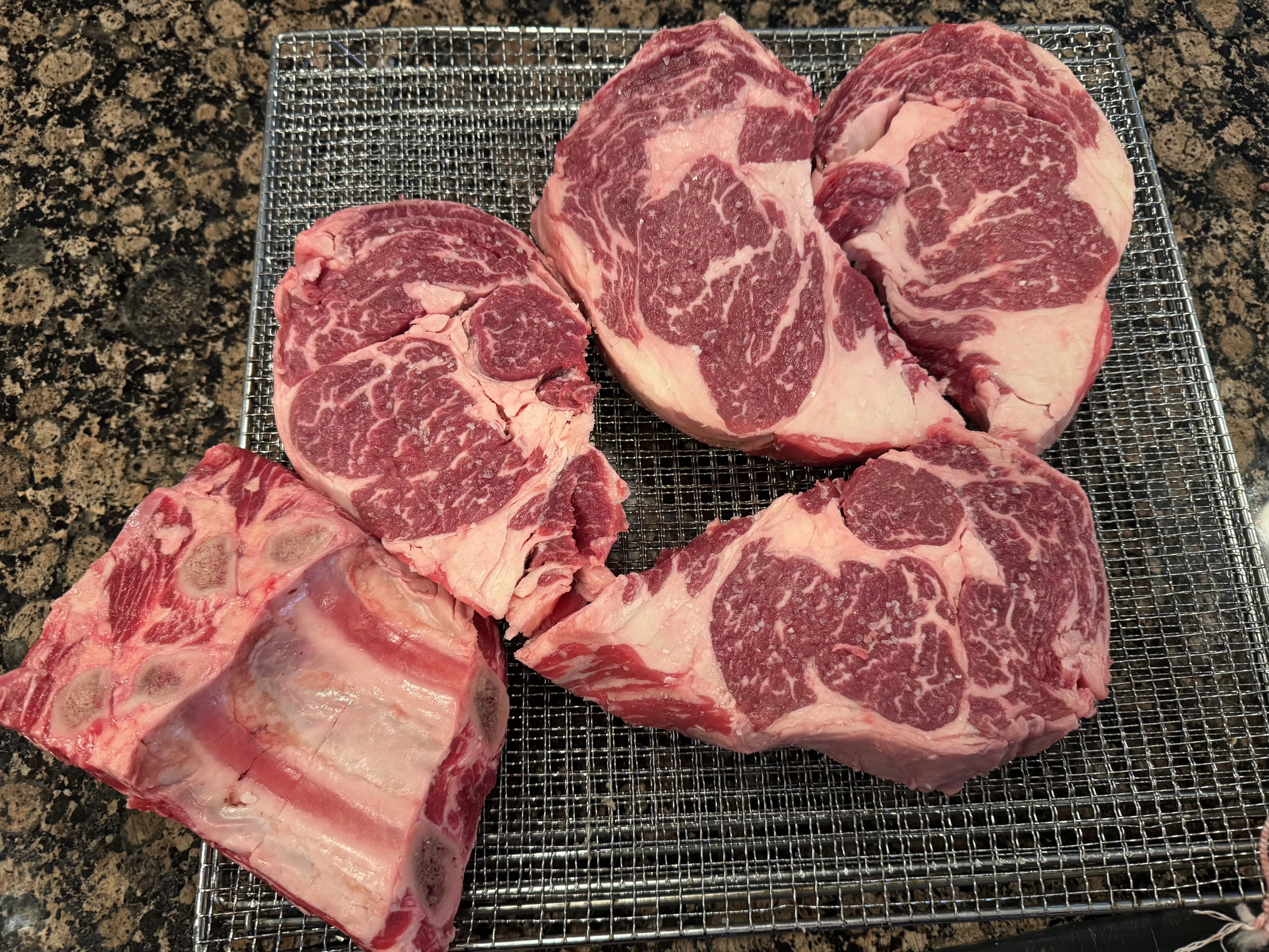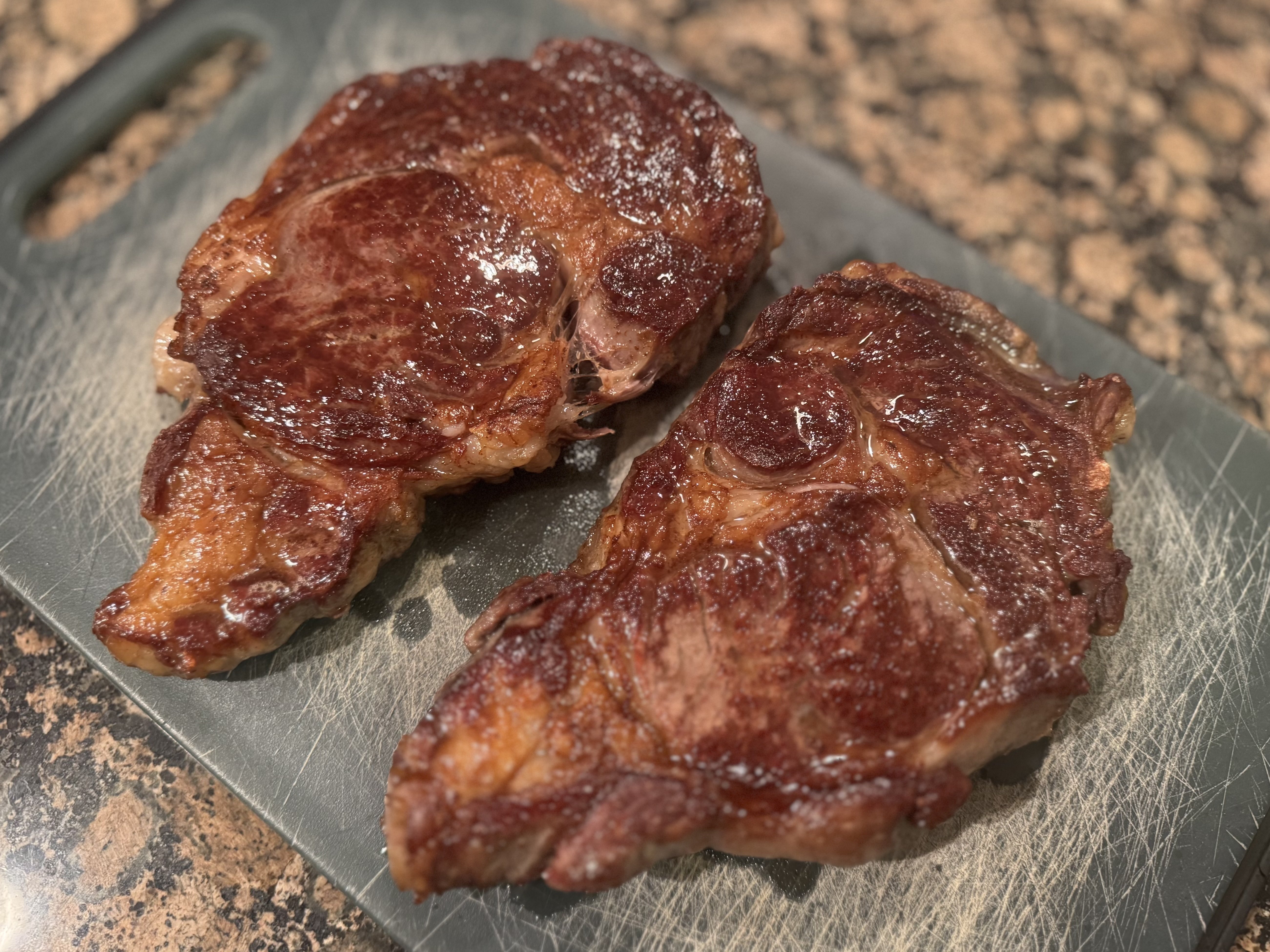 Publix had their standing rib roasts on sale. Cut into 4 nice steaks and cooked 2. Dry brine with salt for 24 hours. Seared in a CI skillet with just salt and butter. So good!