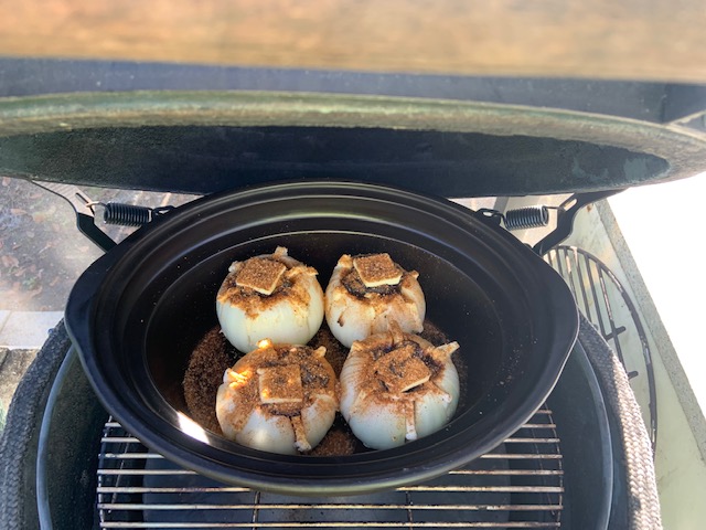 Started with four big sweet onions, cut slits to put pats of butter, topped with a big spoonful of Beef Better than Bullion & some more butter plus Dizzy Pig Shaking the Tree rub...also added some red wine after about 45 minutes indirect at 375...