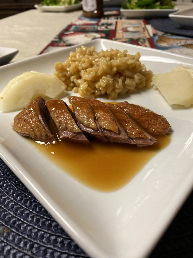Things got a bit busy from here so no pics. I rested the duck in the house oven. I know potatoes are the traditional choice of starch but the wife and son wanted risotto - so I made risotto. These ducks didn’t render a lot of fat so it was ok.