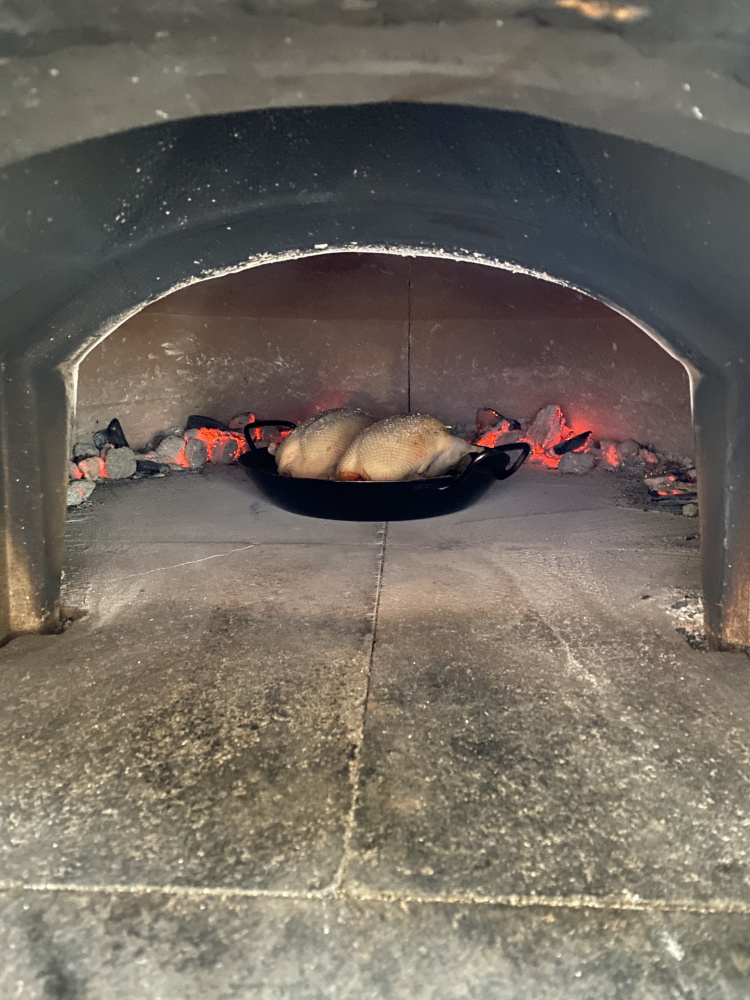 Toward the end of the cook I was thinking I needed a bit more heat to brown the ducks well and crisp the skin. But how to do that? It’s not like the wood oven has a knob I can turn...
