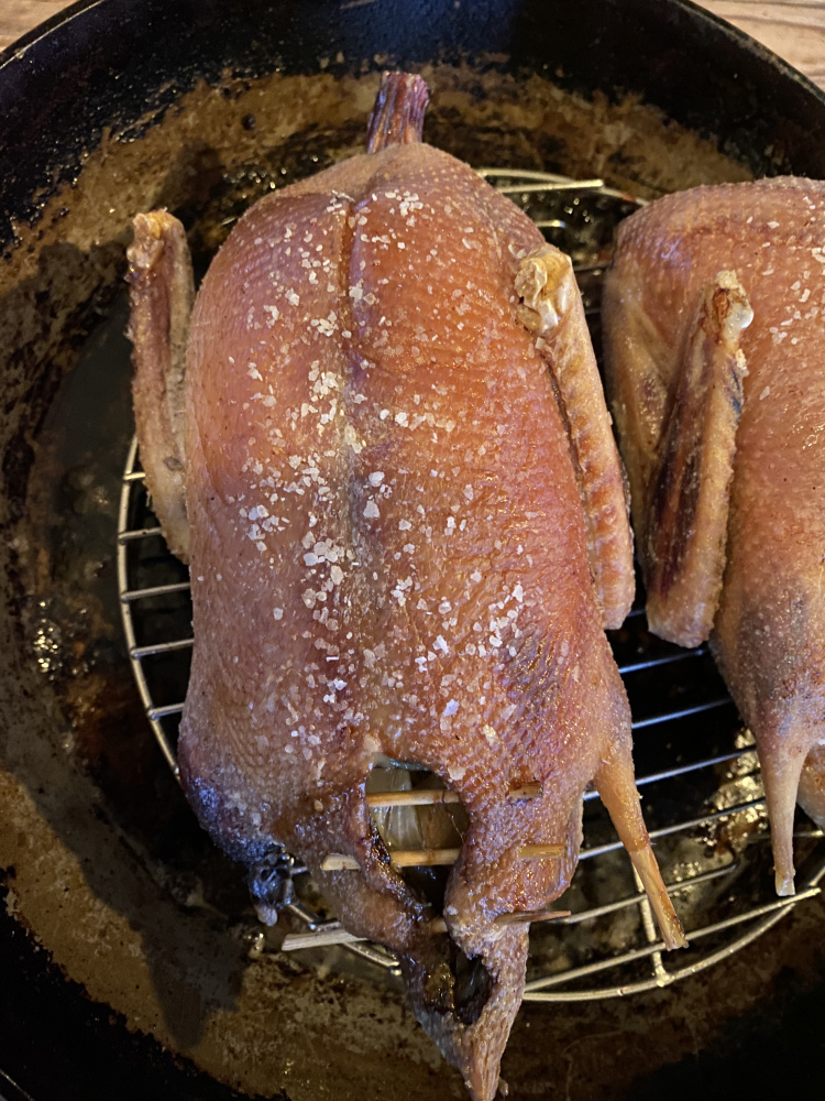 The oven jumped a good 75 degrees or so. Just enough to accomplish what I wanted. Here’s the ducks as I pulled them from the oven.