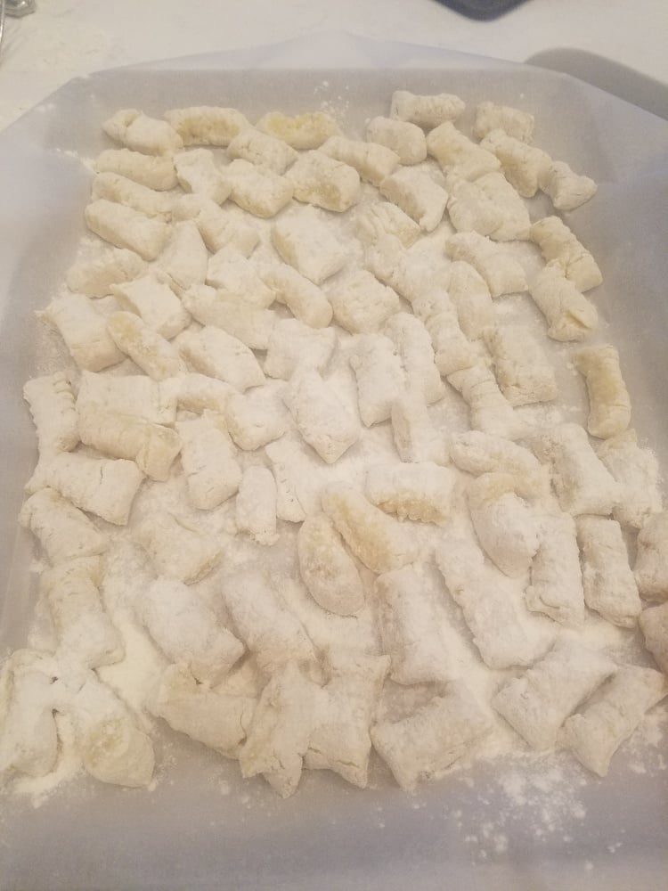 After the potatoes were done, I made the dough and cut the gnocchi. Hardest part was trying to get the ridges with a fork. Italian grandmas make it look easy. I didn't know how long this process would take, so made them early in the day and froze them to be boiled at dinner time.