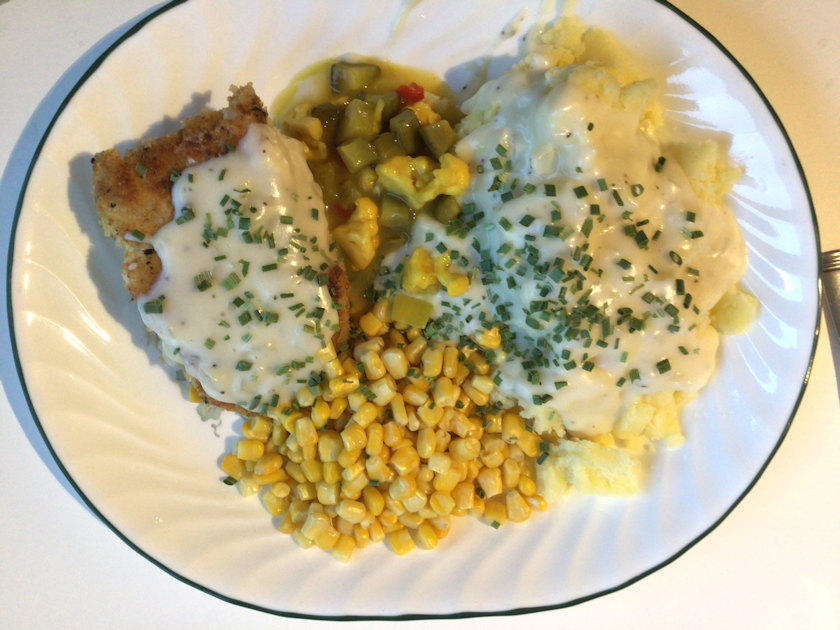 Plated with some mash potatoes, corn and Basic White Sauce and home made mustard pickles. For the Sauce, I also fried some onions in the butter at the beginning. To thicken I added Potato Starch (more on that below)