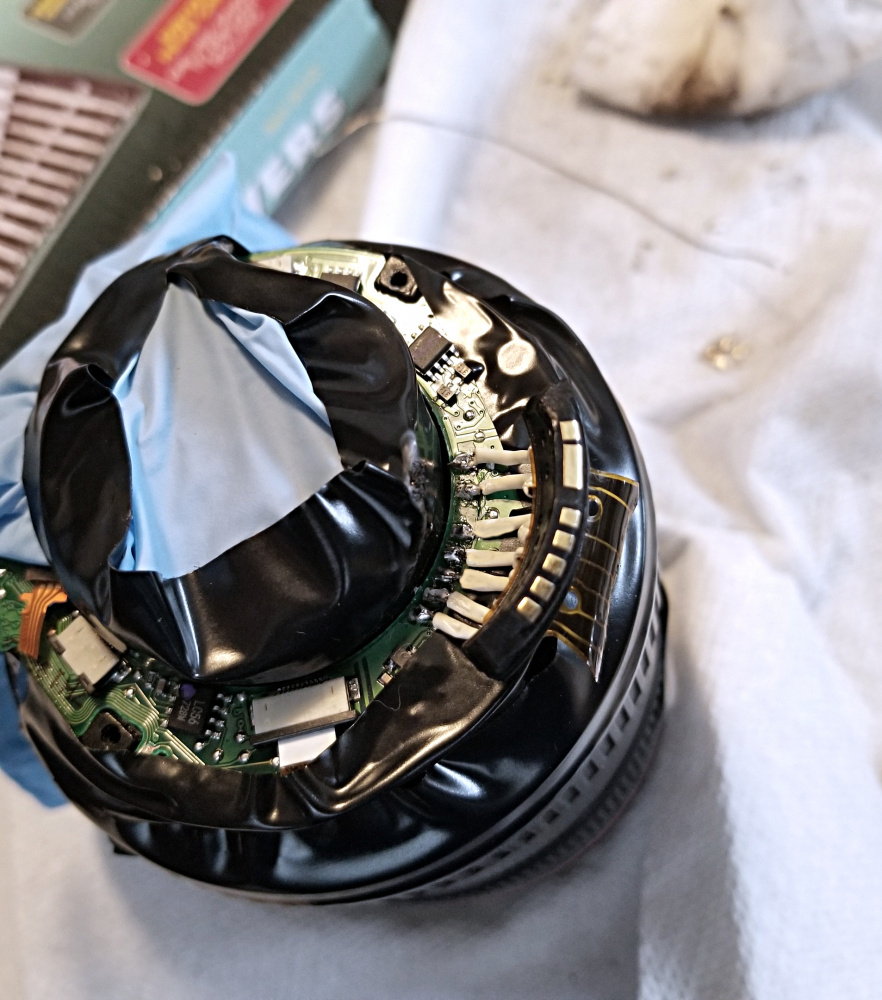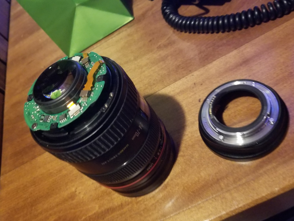 Shooting a anniversary event. External battery pack got snagged on my waist bag and snatched entire camera off a bar height table, sling shot it across the room. Canon says lens too fragile and beyond shelf life repair. $1990 to replace it. So under the knife we go. Missed the cut ribbon cable when I put it back together. However. Lens shoots, meters, just no autofocus. Manual focus for now. I suspect ribbon cable. Thank you youtube.