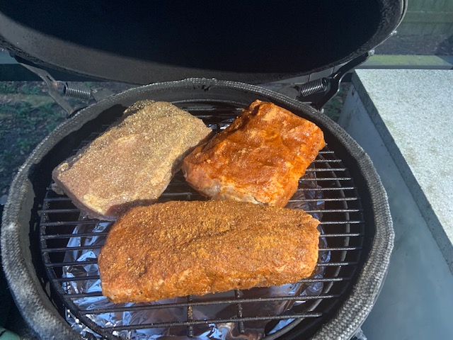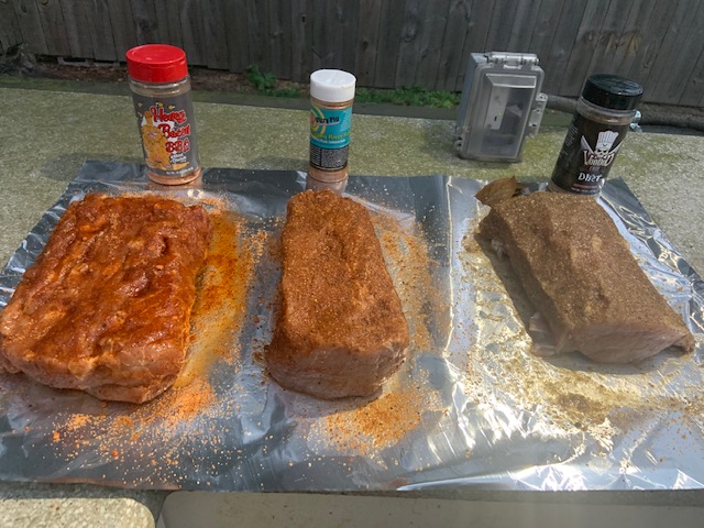 Made some delicious burgers for dinner tonight (no pictures) & decided to smoke the pork since the Egg was hot...used a different rub on each section...L to R is Meat Church Honey Bacon BBQ, then Dizzy Pig Raging River & then Voodoo Chef Dirt...