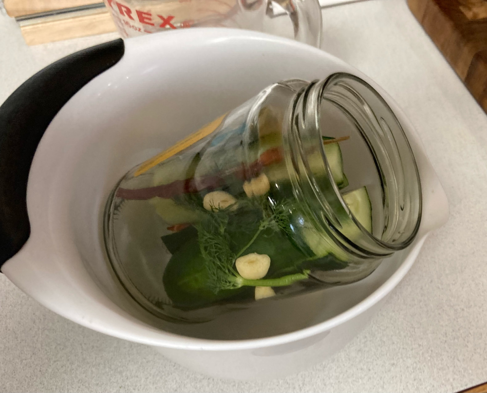 My cukes were kinda big so I had some spears left; I grabbed a third jar and got it half-filled then topped off with half ACV and half water to cover. Use a spoon to evenly transfer the seeds from the bottom of the pot to the two or three jars. I'm set for a month or so now!