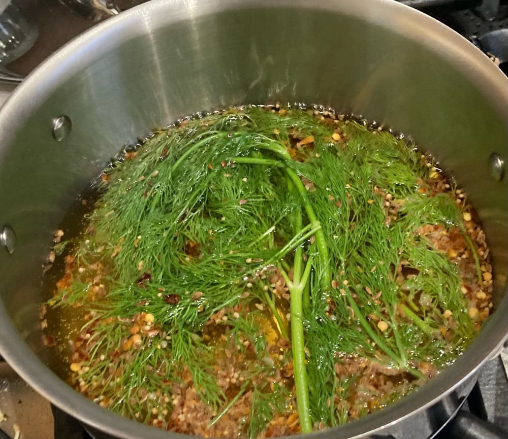 I made the following modifications: I used a large tray of dill from the grocer (keeping two strands for the jars), wasn't 1 cup but ah well; I also didn't have cheesecloth so I just added them whole, pulled them out with my tongs. I also added 1.5 tsp crushed red pepper flakes instead of a japoné, the latter which must be hydrophobic as it floated on top, wouldn't get "wet", and even after two weeks in the frig, it still floated/didn't soften.