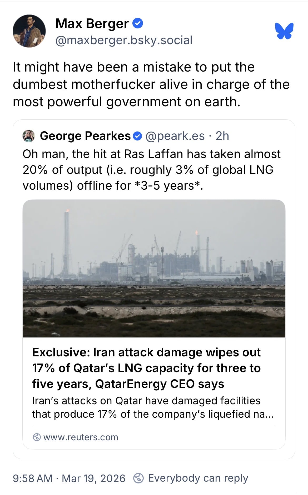 Yep, something that I have seen several times. Gas prices can be ultra low but when someone sneezes in the Middle East gas prices soar. Iran and their Flying Monkeys have done the block the Gulf routine several times. High gas prices never outlast the payments on an EV and low gas prices never outlast the payments on a gas guzzler. I’m in the market for a new different EV late summer/ early fall. As to high electricity prices in the North East and the West Coast are usually, to a large part, the result of State legislation choices.