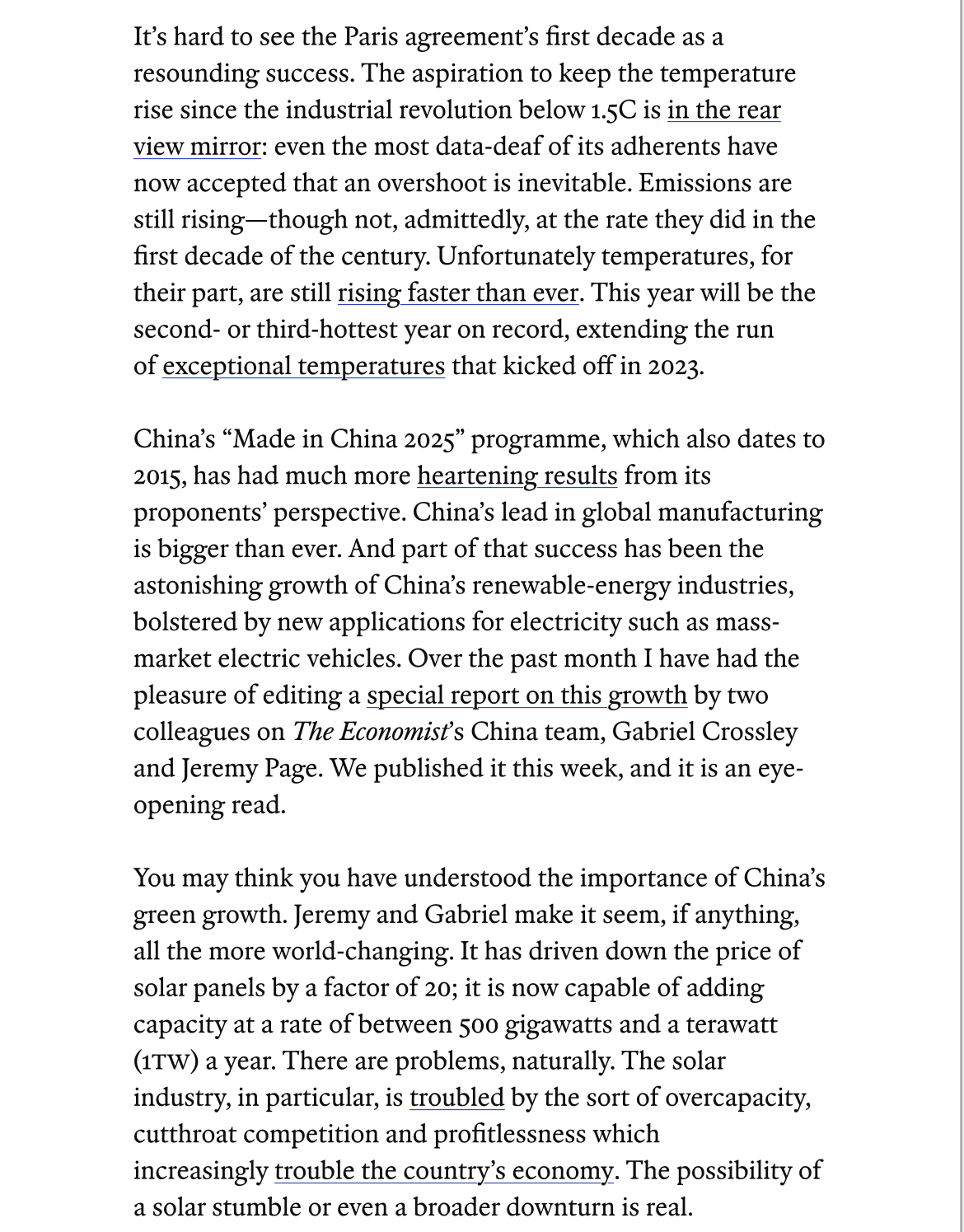 In fact, as Krugman notes, solar and wind are unstoppable. They produced 15% of the world’s electricity in 2024 and account for 63% of the growth in electricity production since 2019. Green energy will continue to grow even if U.S. policy tries to wrench us back to burning coal, “with important geopolitical implications,” Krugman writes. “China is racing ahead.”