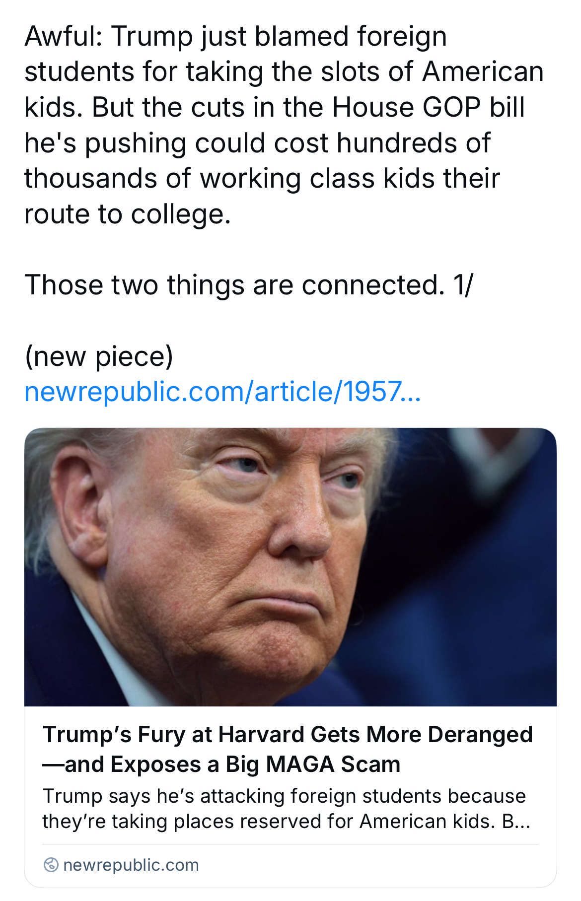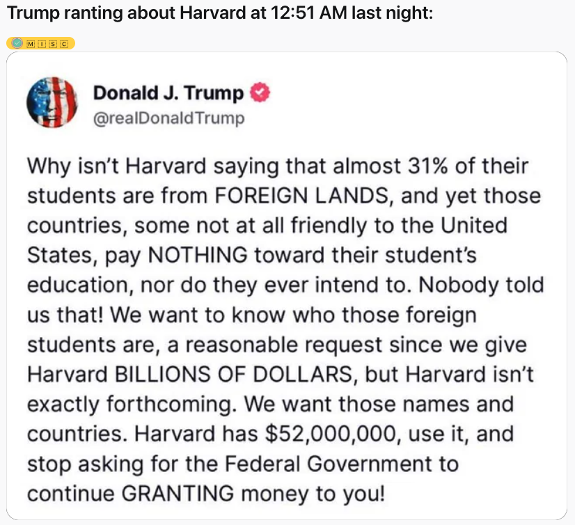 As for this mostly being about Barron, online I can only find speculation that he applied to Harvard. I don’t think there’s ever been any confirmation of that, never mind getting rejected. It’s a reasonable assumption with Trump that there may be a personal grievance aspect to the administration’s fight with Harvard, but I think there’s a lot more to it.