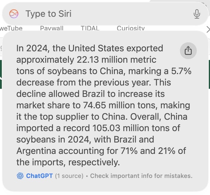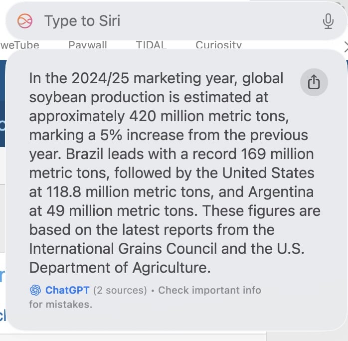 I asked Siri how many tons of soybeans are grown annually, and got this answer: