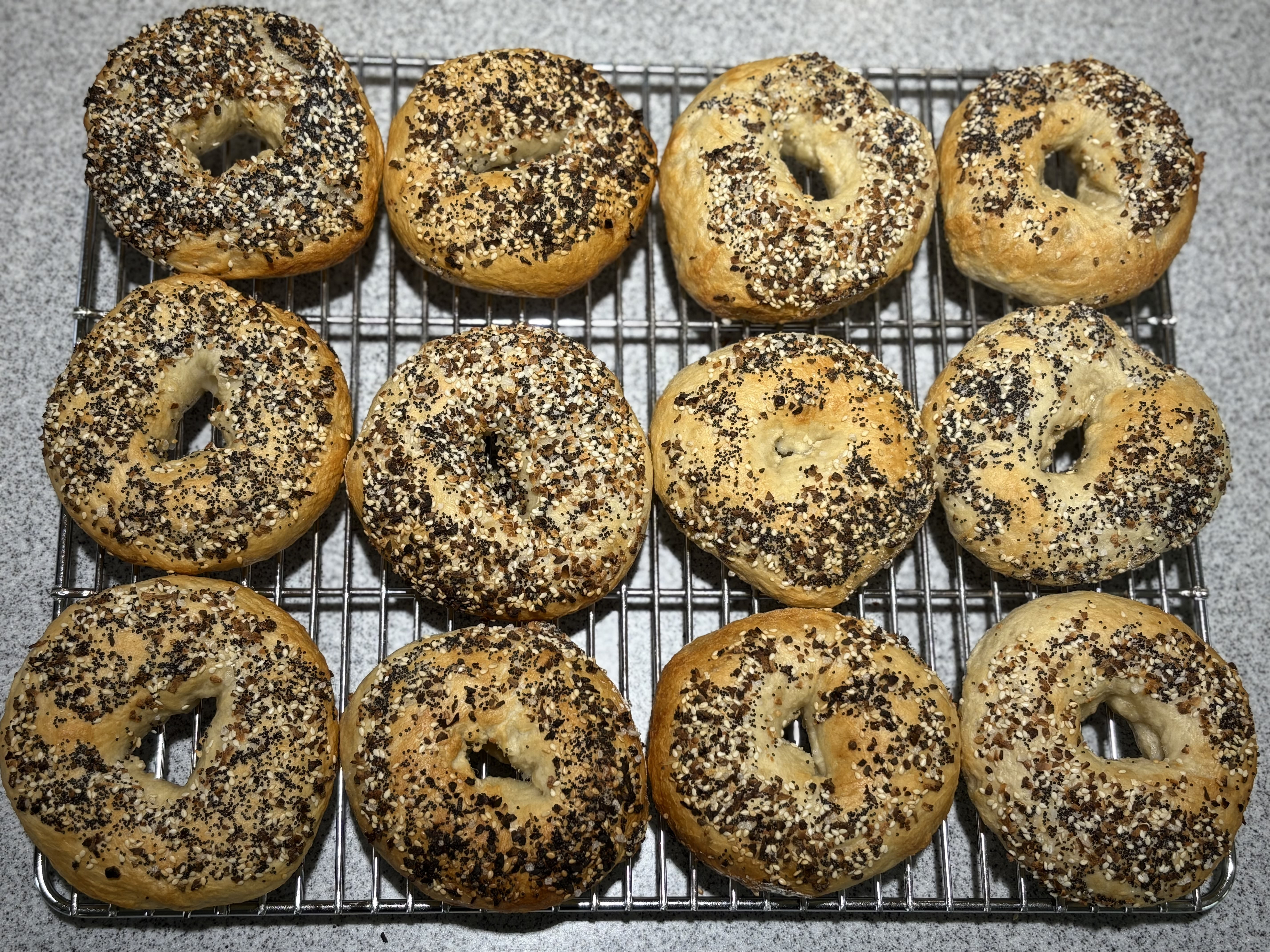 I've seen all different ingredients in the boiling water to provide a brown crust (malt powder, malt syrup, honey, baking soda, lye) so I experimented a bit: first three bagels had only salt in the water (the unseeded ones below), then non-diastolic (sp?) malt powder for the next six (per the BGE recipe), then finally added a Tblspn of baking soda to the water for the last three. You can easily pick those out below, but the soda made the water foam up badly and almost overflowed (don't know if starting with the soda in cold water would help). Topping was "Everything Bagel" from King Arthur Flour.