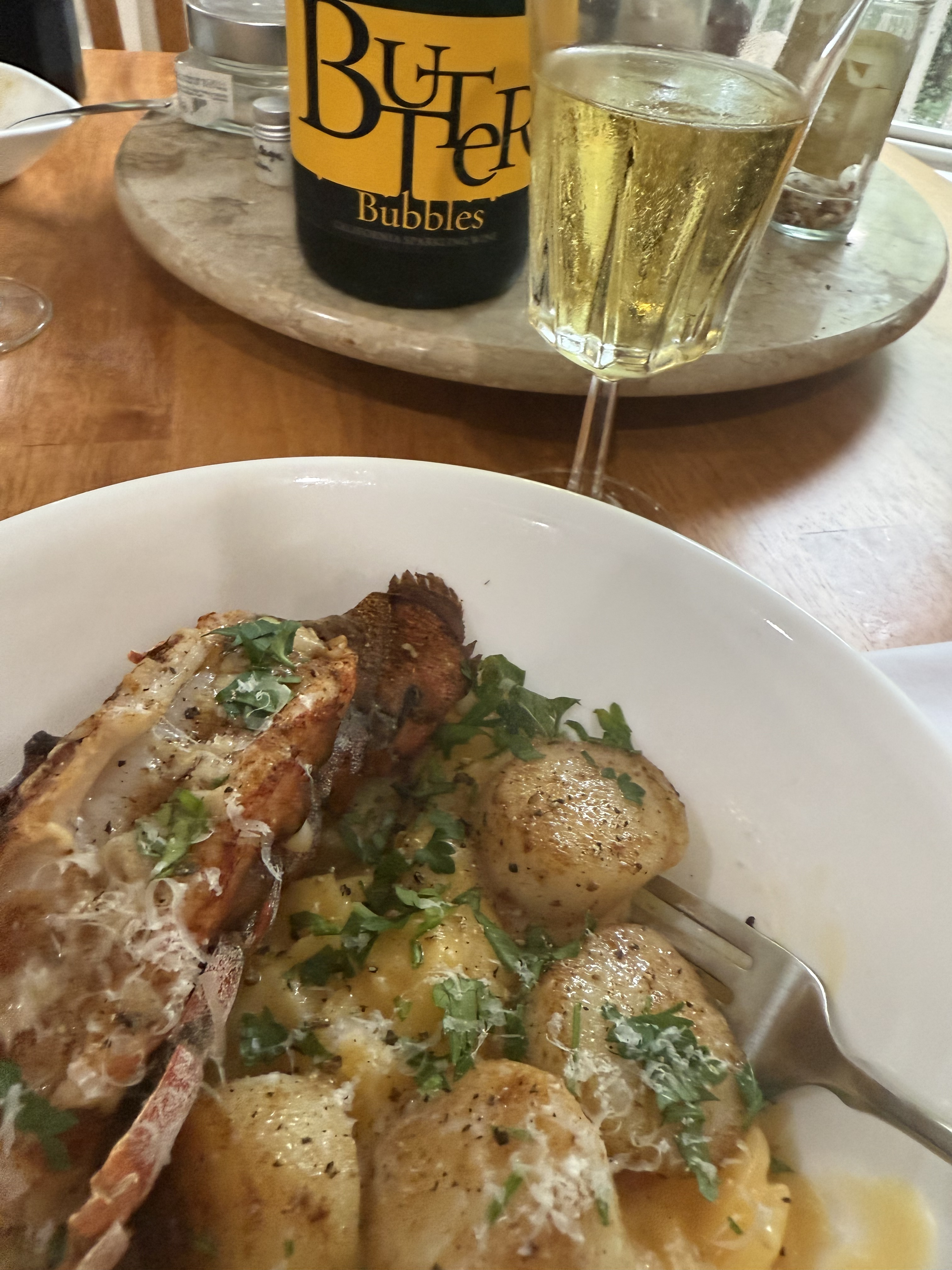 inside. Regardless had some of my fave (inexpensive) California bubbly and scallops and lobster tail over scalloped potatoes to celebrate. -