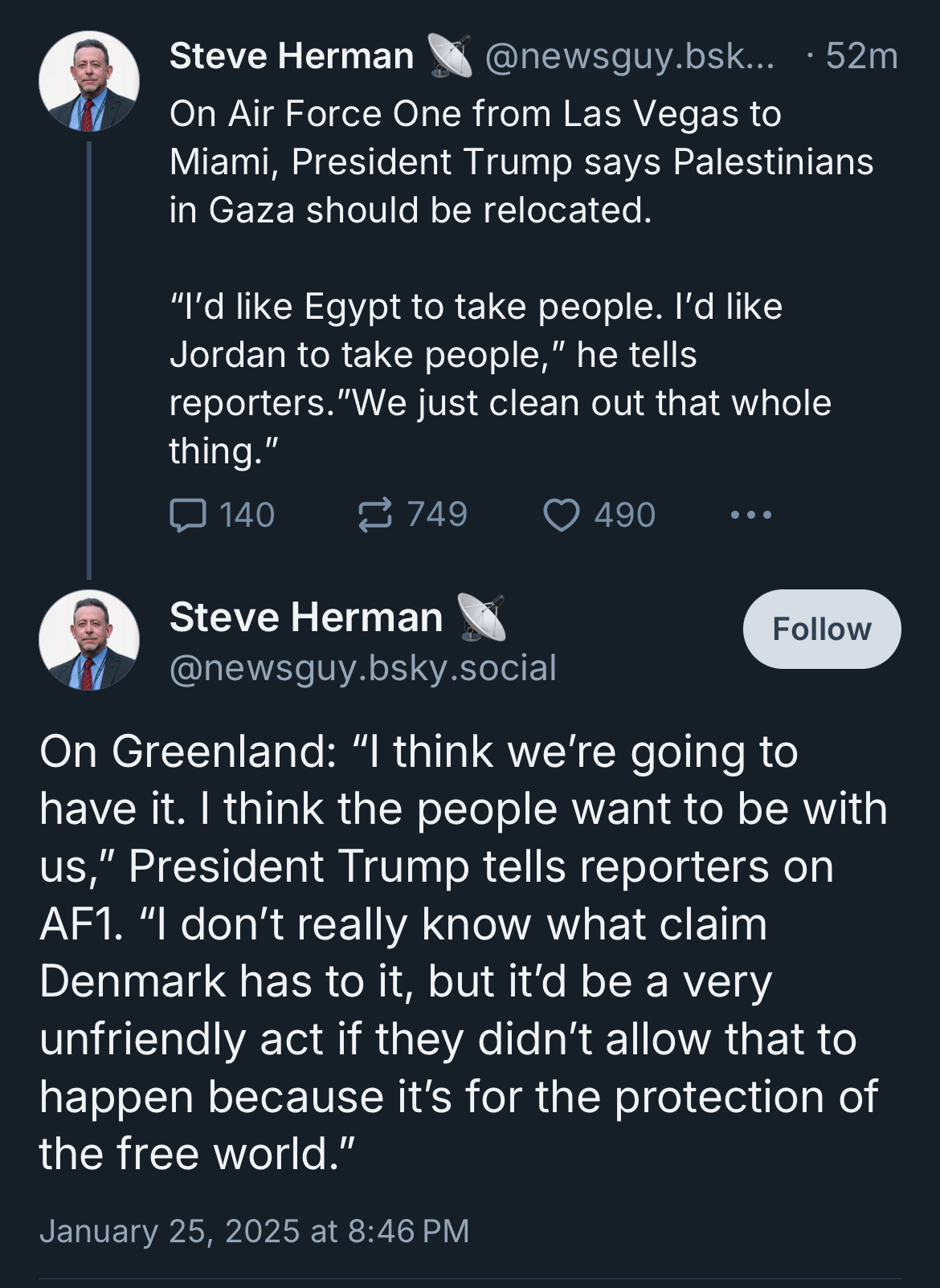 CPFC1905 said:Good to see the big ticket items being dealt with early, like the name of part of the Atlantic Ocean and a mountain. Hope that real estate deal for Greenland gets done, because that's been on everyone's mind too. What's left? Afetrall Ukraine was sorted within a day of inauguration, as promised.