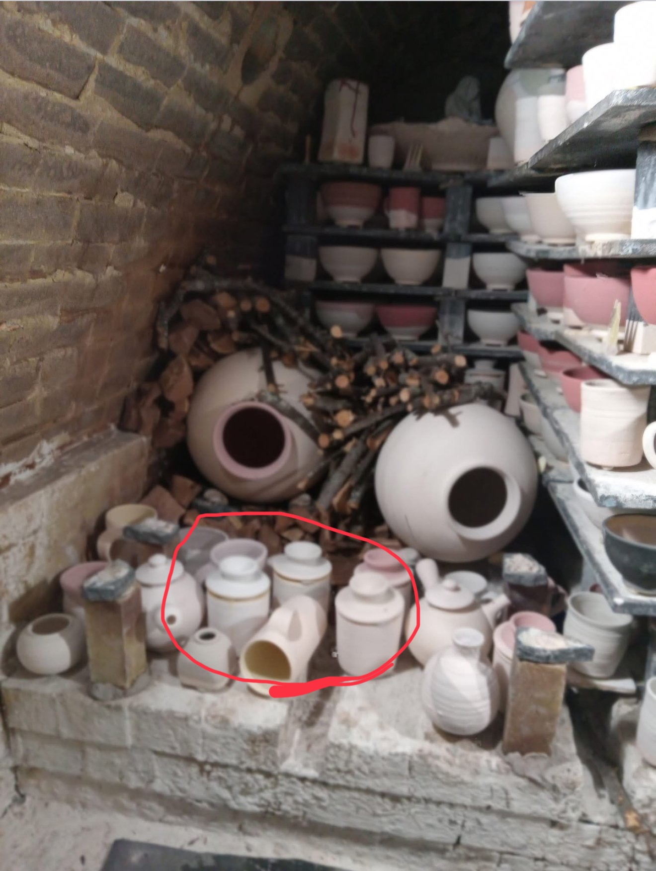 My uncle hasn’t made the butter keepers for the November firing yet. Also, most pieces go in to the anagama uncolored, the color comes from the various species of wood and resultant ash used for the firing. In this photo, circled in red are three of the butter keepers from this past firing, so there is no way to predict the outcome: