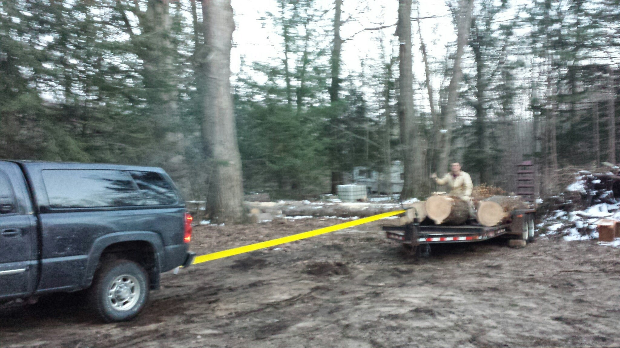 Sorry for the blurry pic. I helped my cousin haul logs from a pine that he used to build his cabin.  HIS friend has a Wood Mizer portable mill.  We did not have proper equipment.  That trailer doesn't owe anybody anything!  I think we somehow positioned two more on top of the three shown.  Similar to this: