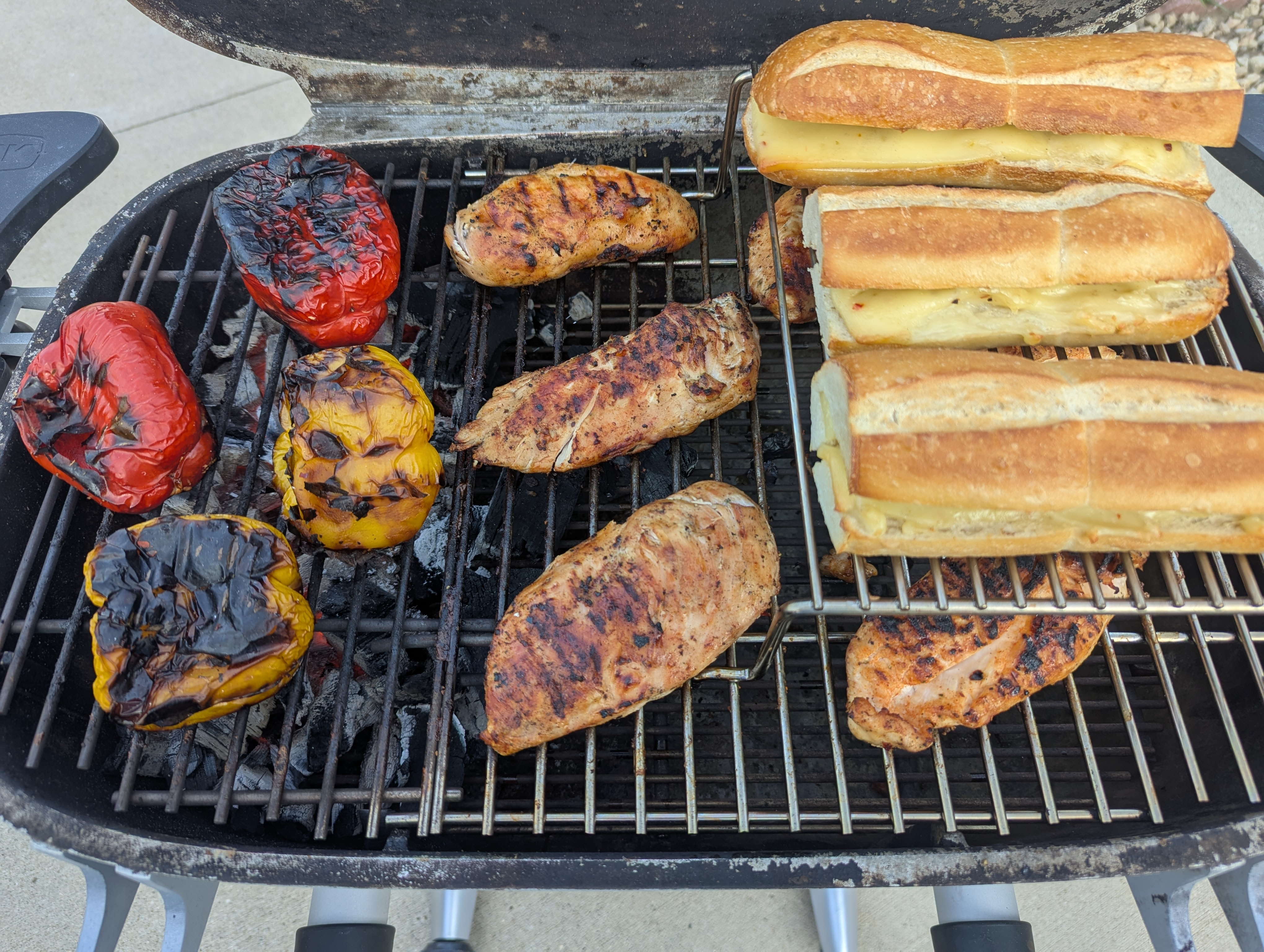 My neighbor stopped over when I was out in my garage and he brought over some homemade pesto that he made from from his garden and some chocolate chip cookies. So I made a roasted peppers chicken pesto sandwich this evening.