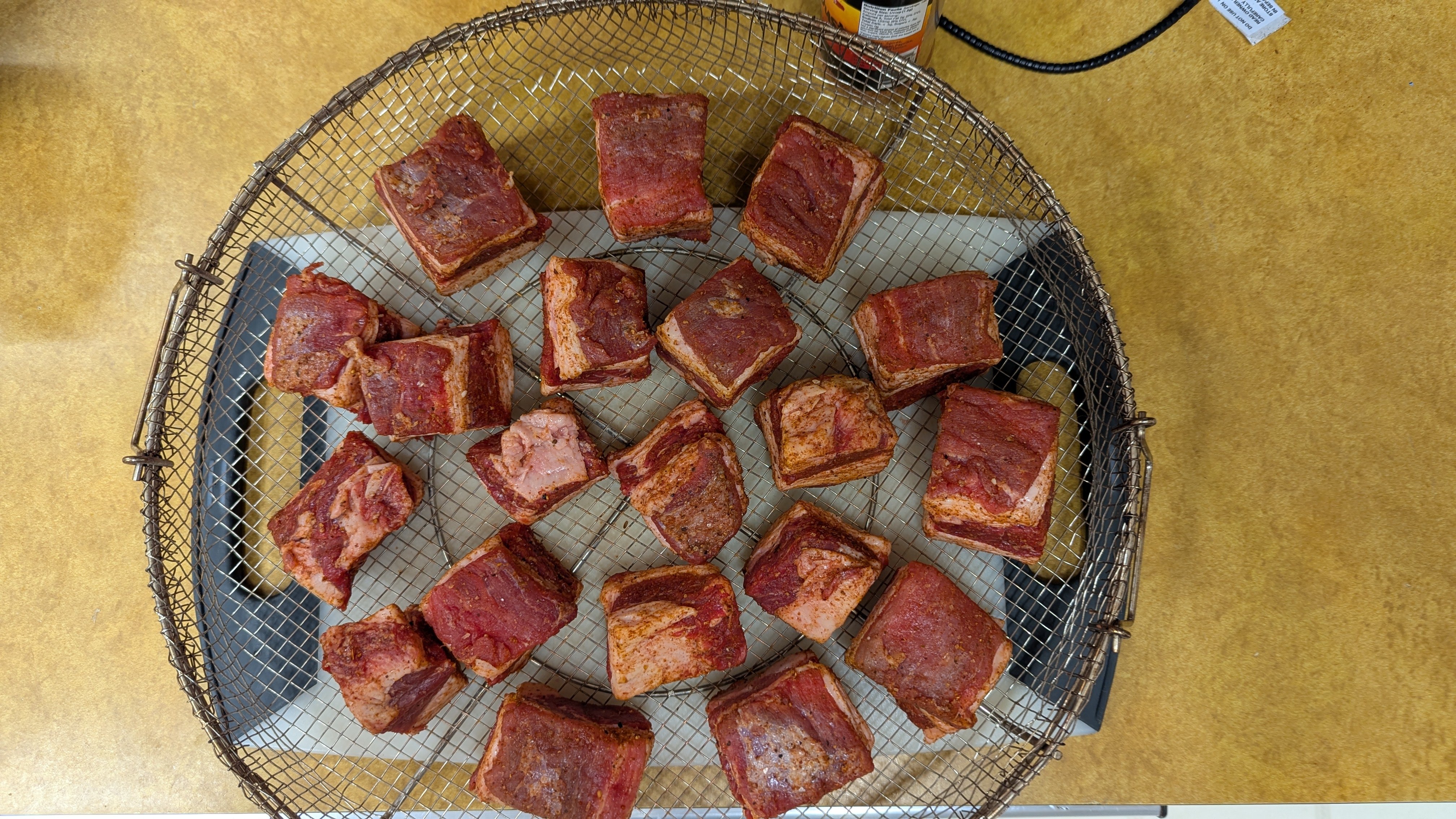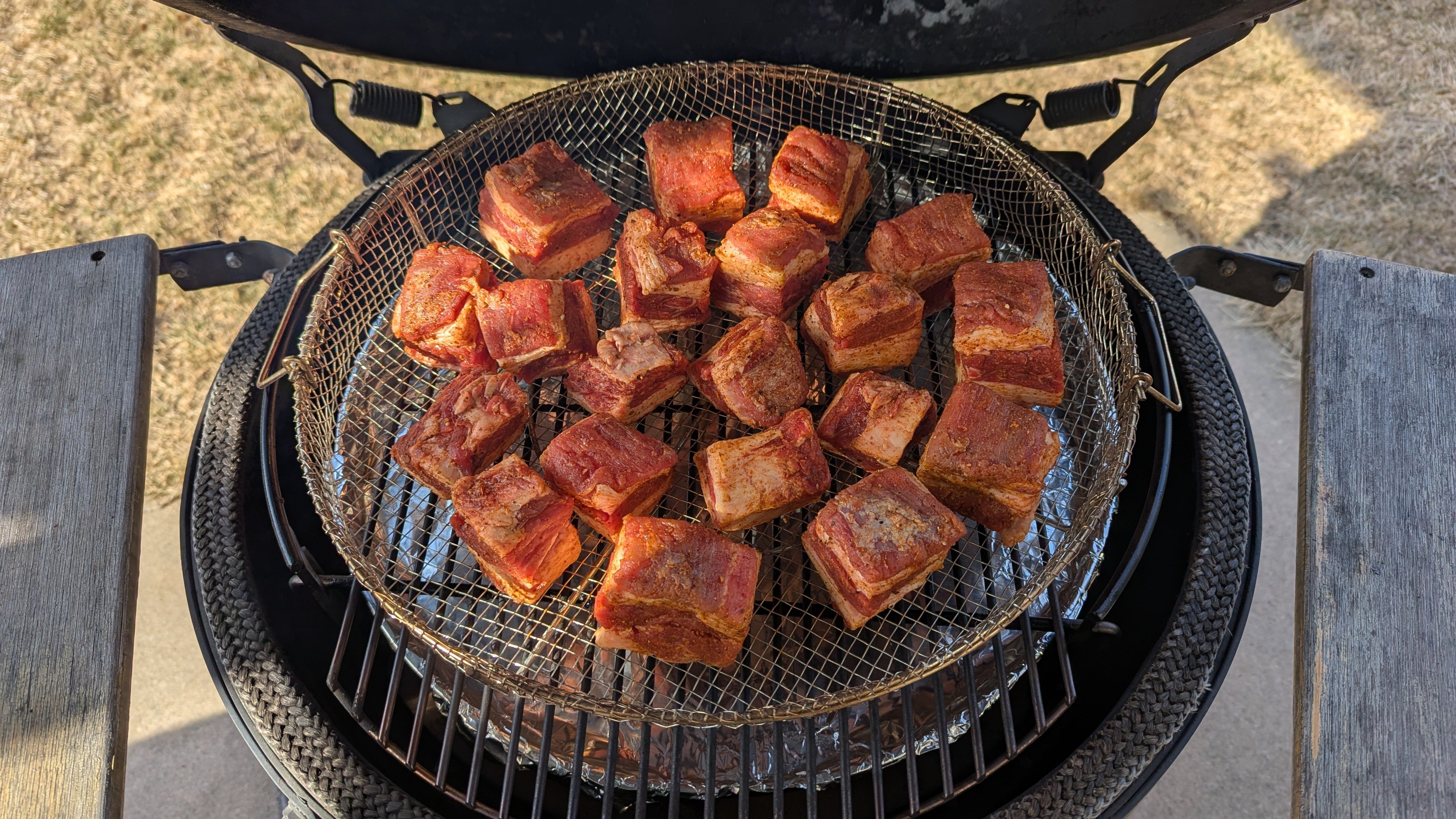 Cubed the belly into approx 1.5" squares and seasoned with the Dizzy Dust.  On to the Egg for the smoking phase.  Cherry wood chunks, temp 260ish . . .