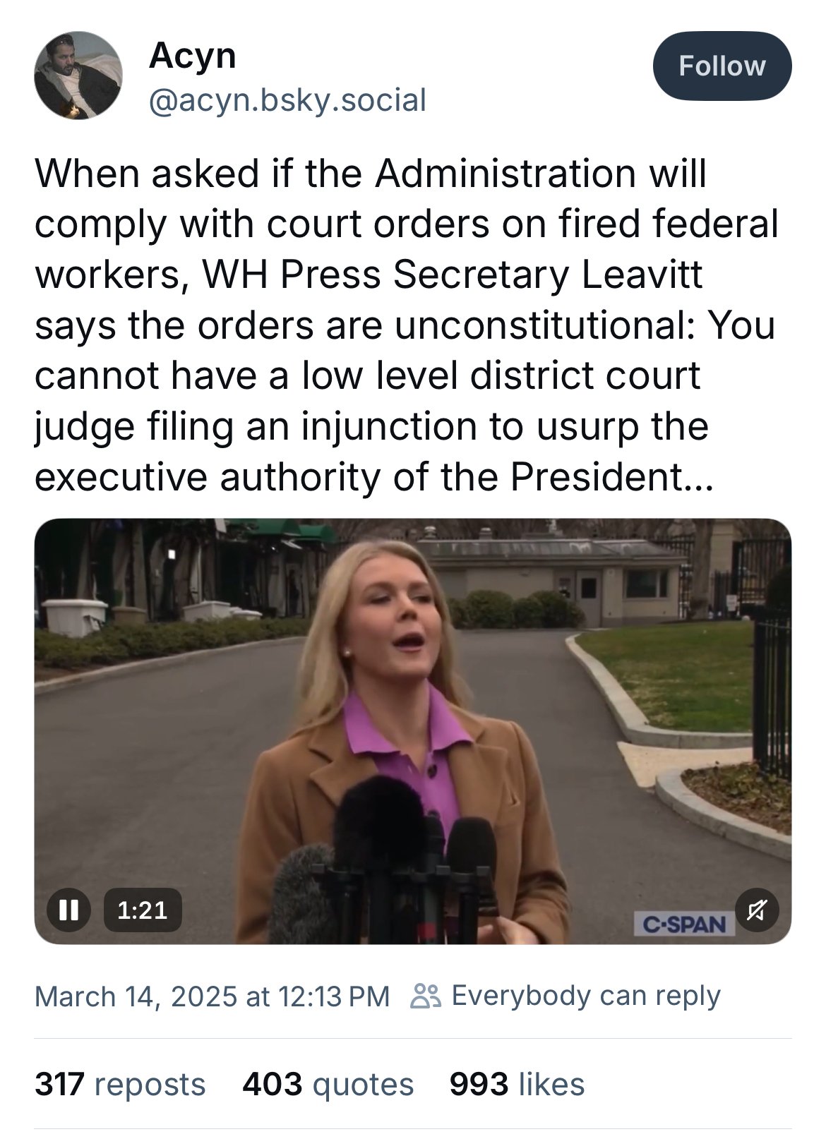 Try to imagine, for a moment, the right-wing freak out had a Biden or Obama press secretary ever said something similar. Never mind the actual defiance of a federal judge.