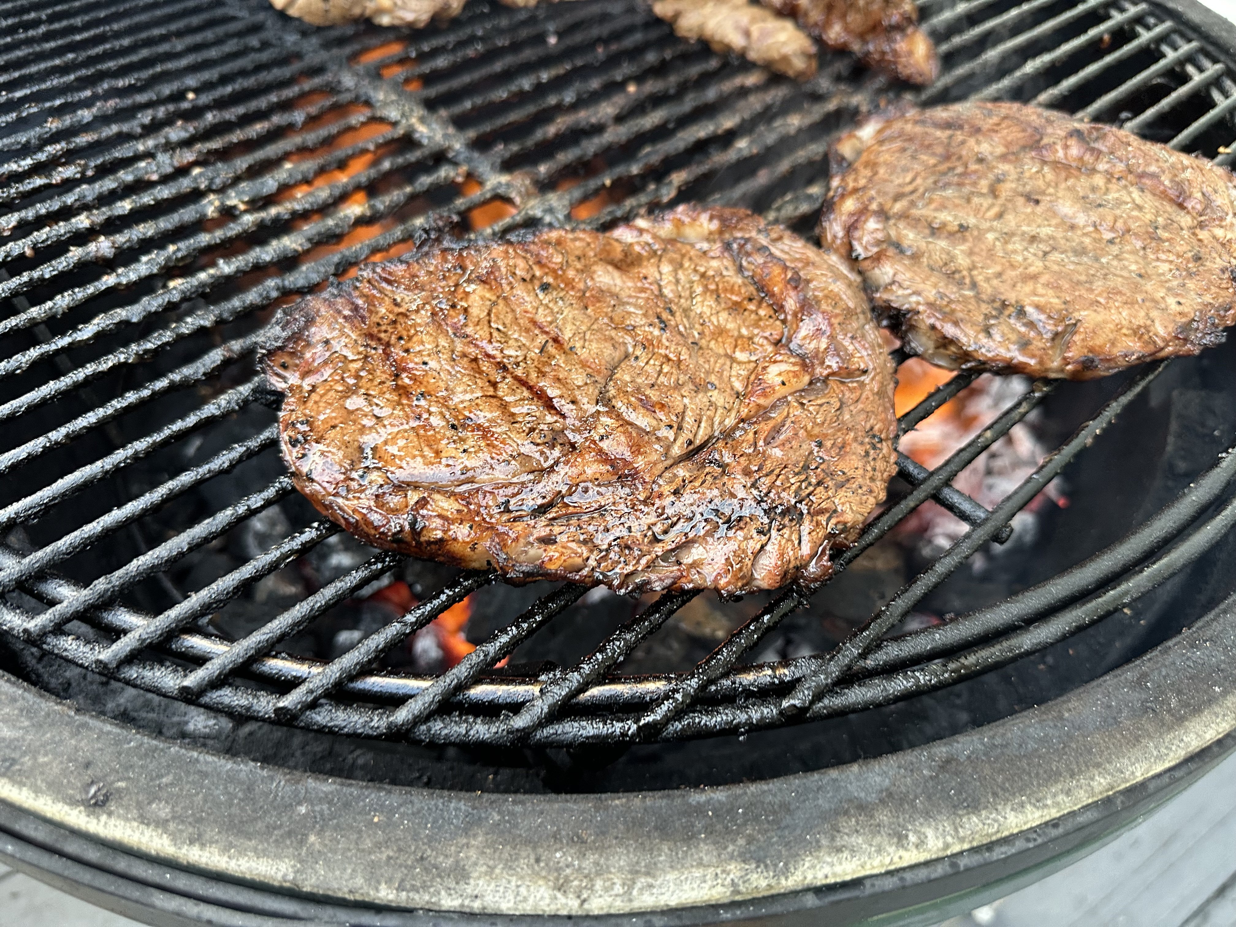 Wow, what a great birthday meal.Large Egg with adjustable rig, Kick Ash Basket, Minimax and various Weber's.