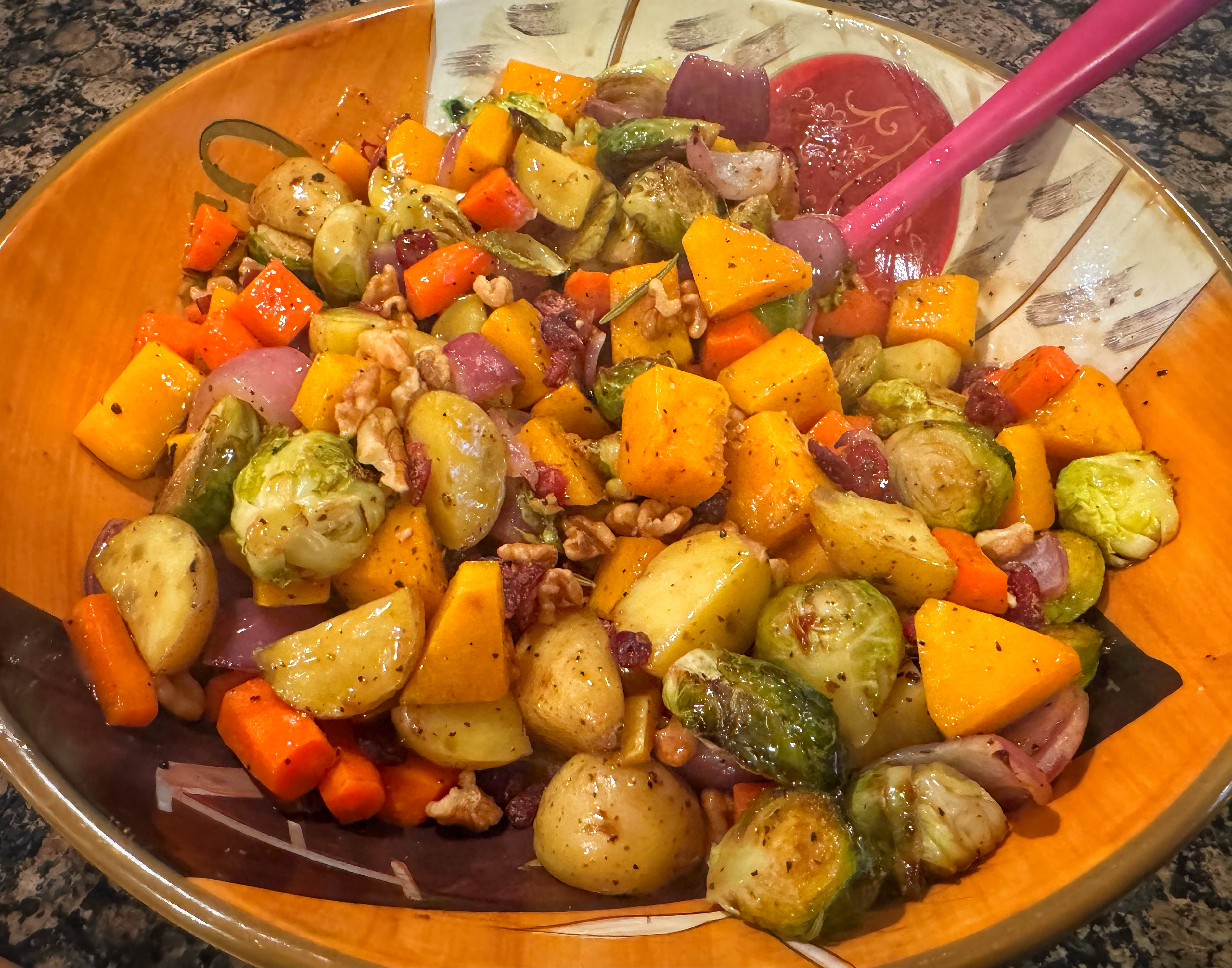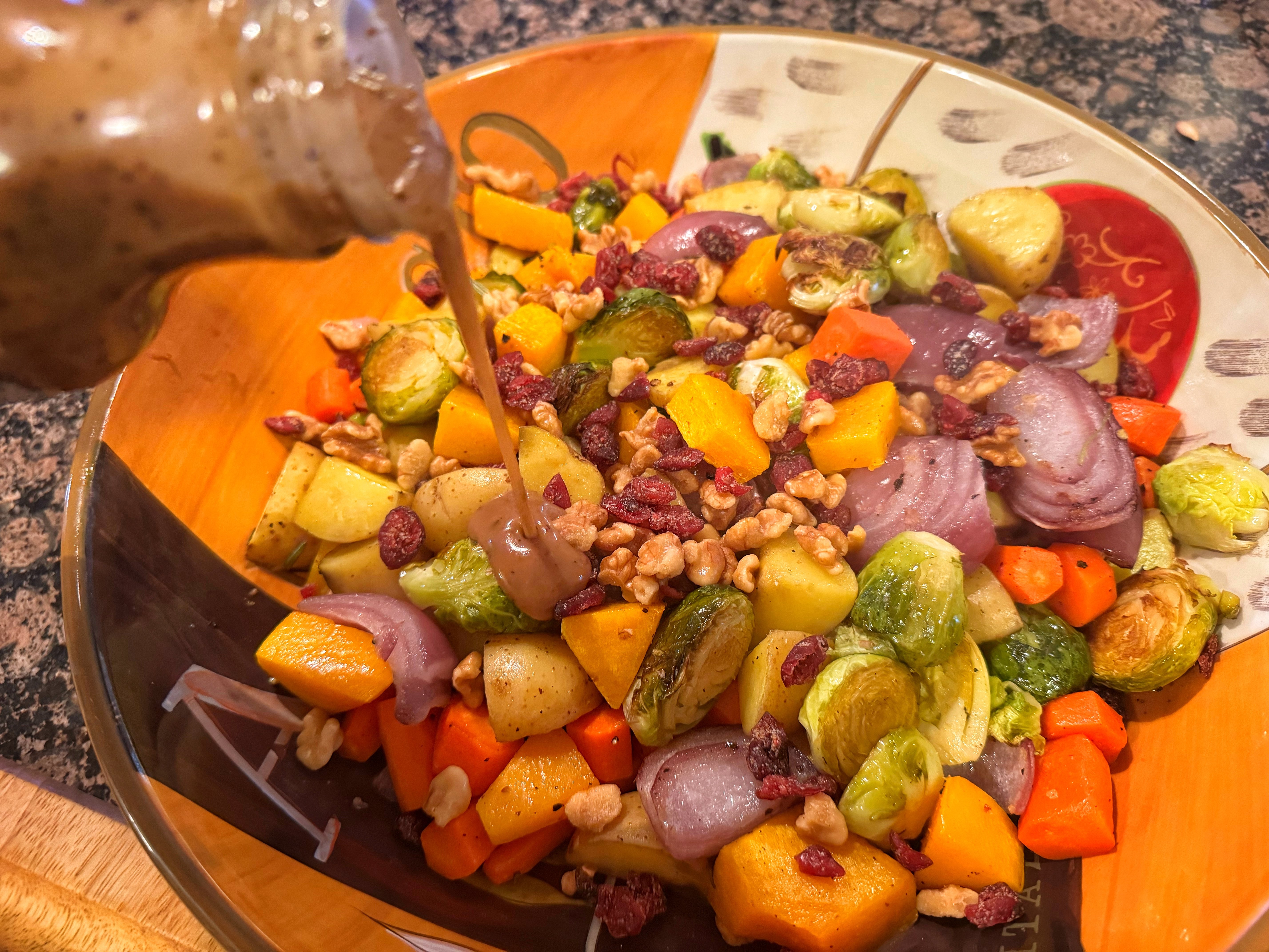 Once the veggies finished, tossed on the walnuts w/ dried cranberries and some Panera brand vinaigrette.