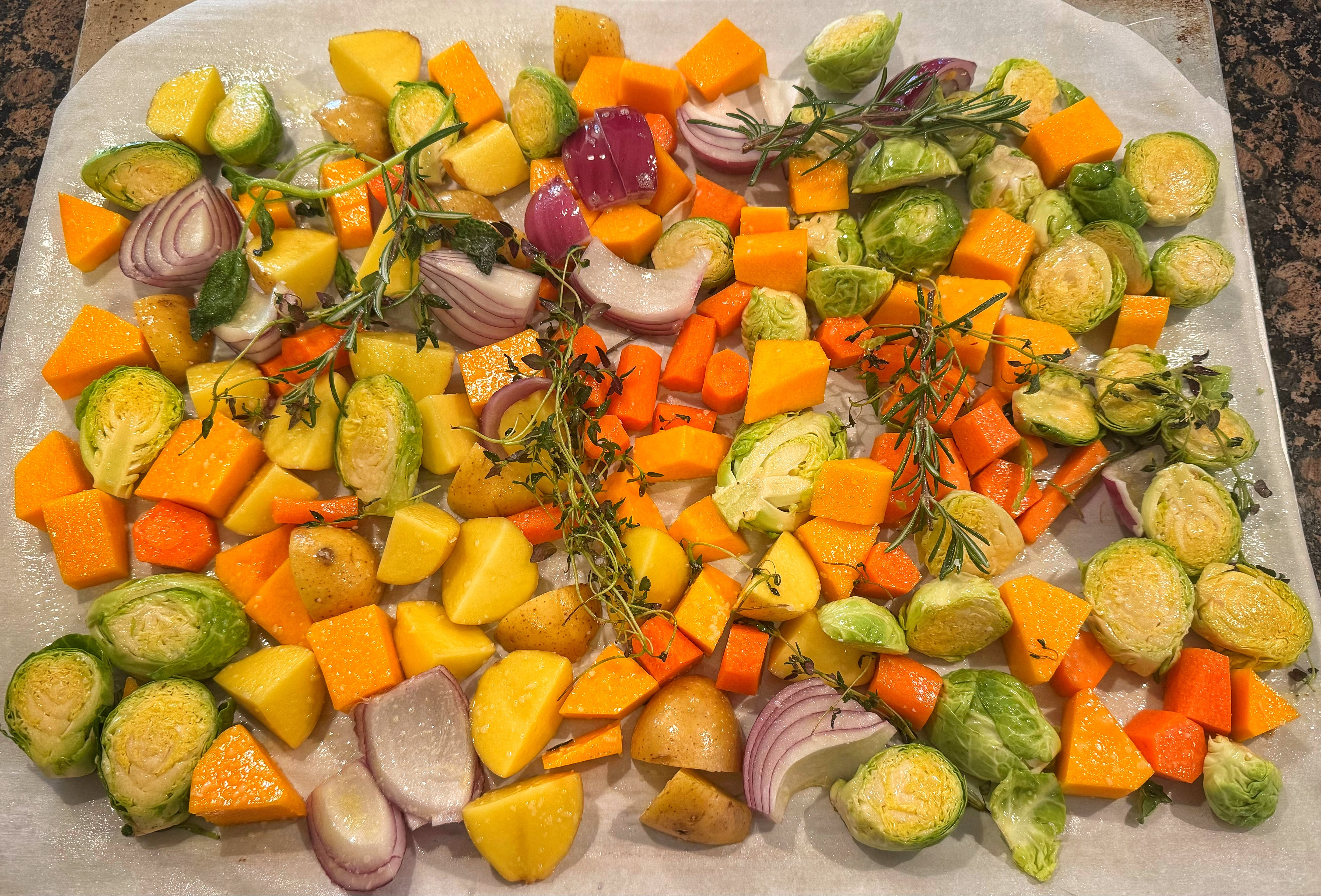 I’ve been in the mood for veggies lately and threw this together. Inspired by a copycat version of Cava’s roasted veggies. It called for pomegranate seeds, but food lion didn’t have those. Used walnuts with dried cranberries instead. Veggies were brussels, potatoes, carrots, butternut squash, red onions, and herbs. Tossed with EVOO, salt and pepper. Went in the oven at 425 f for 25-30 minutes(ish), tossed halfway through and also pulled the herb stems out halfway. Recipe I found said 15 minutes, but they were also using 2 baking sheets, and I crowded it all on one huge baking sheet. Hence the extra time.
