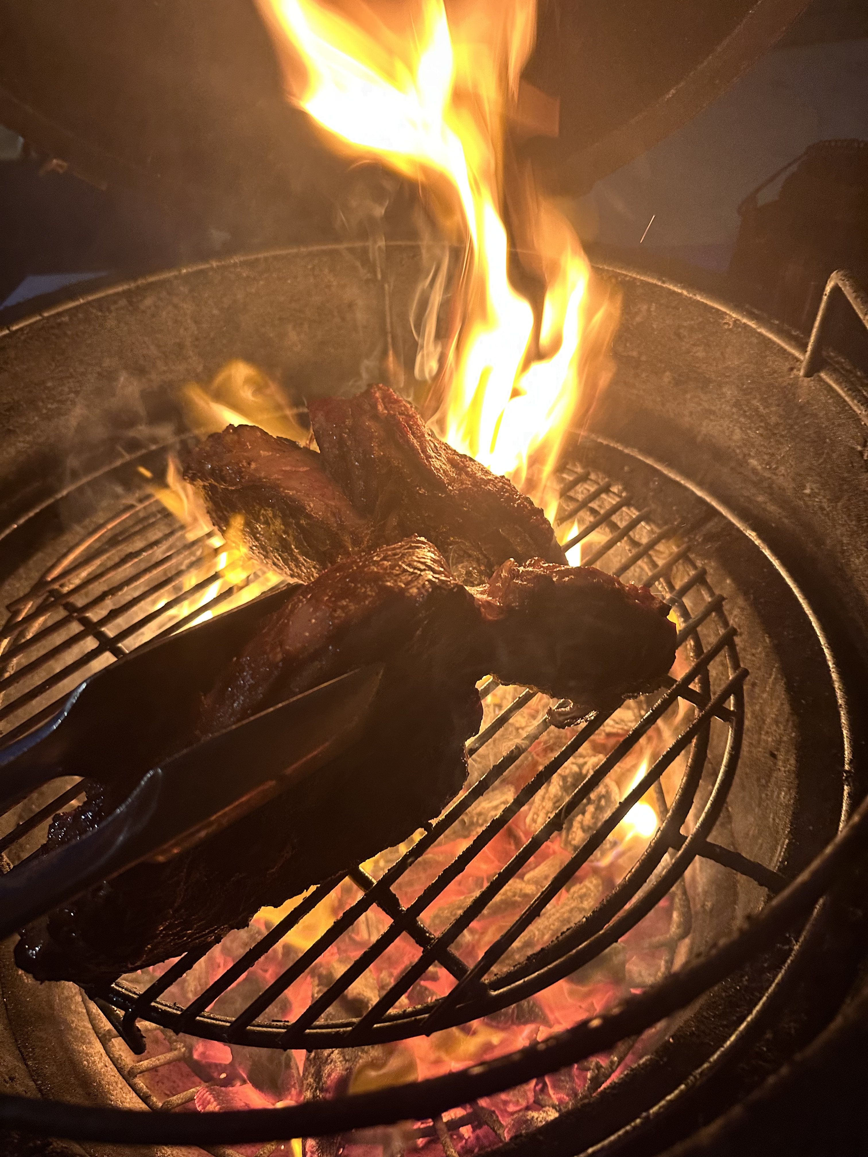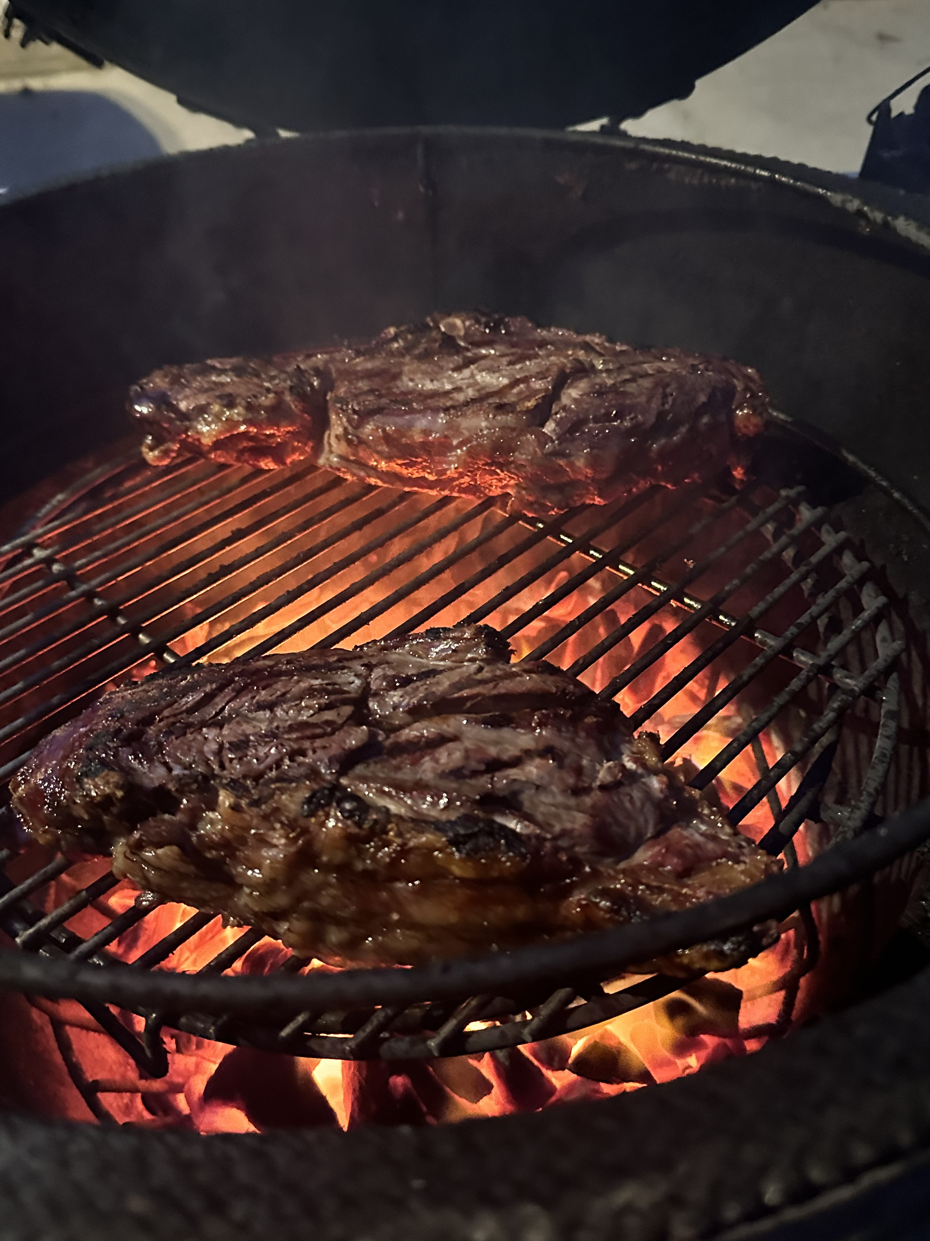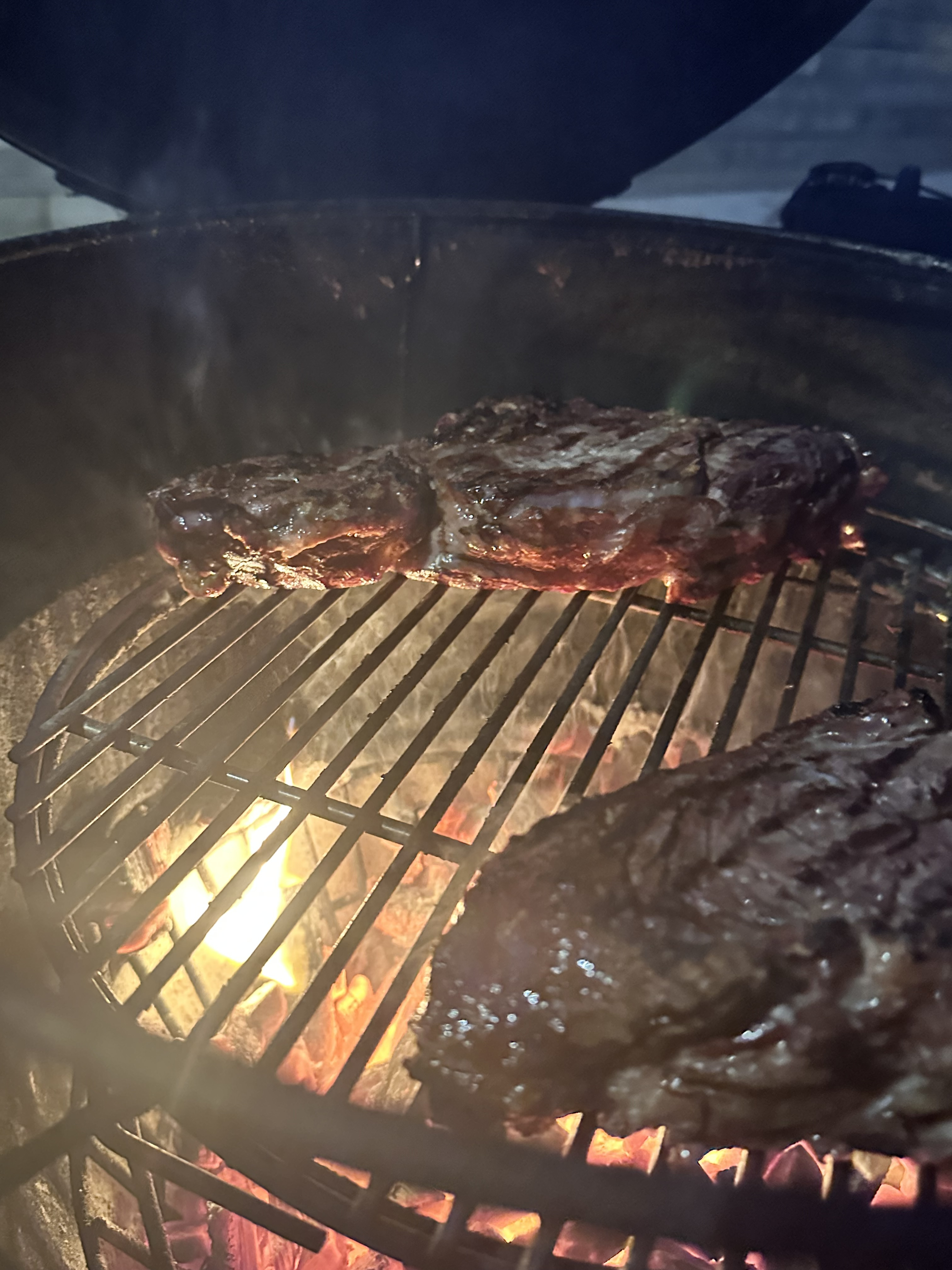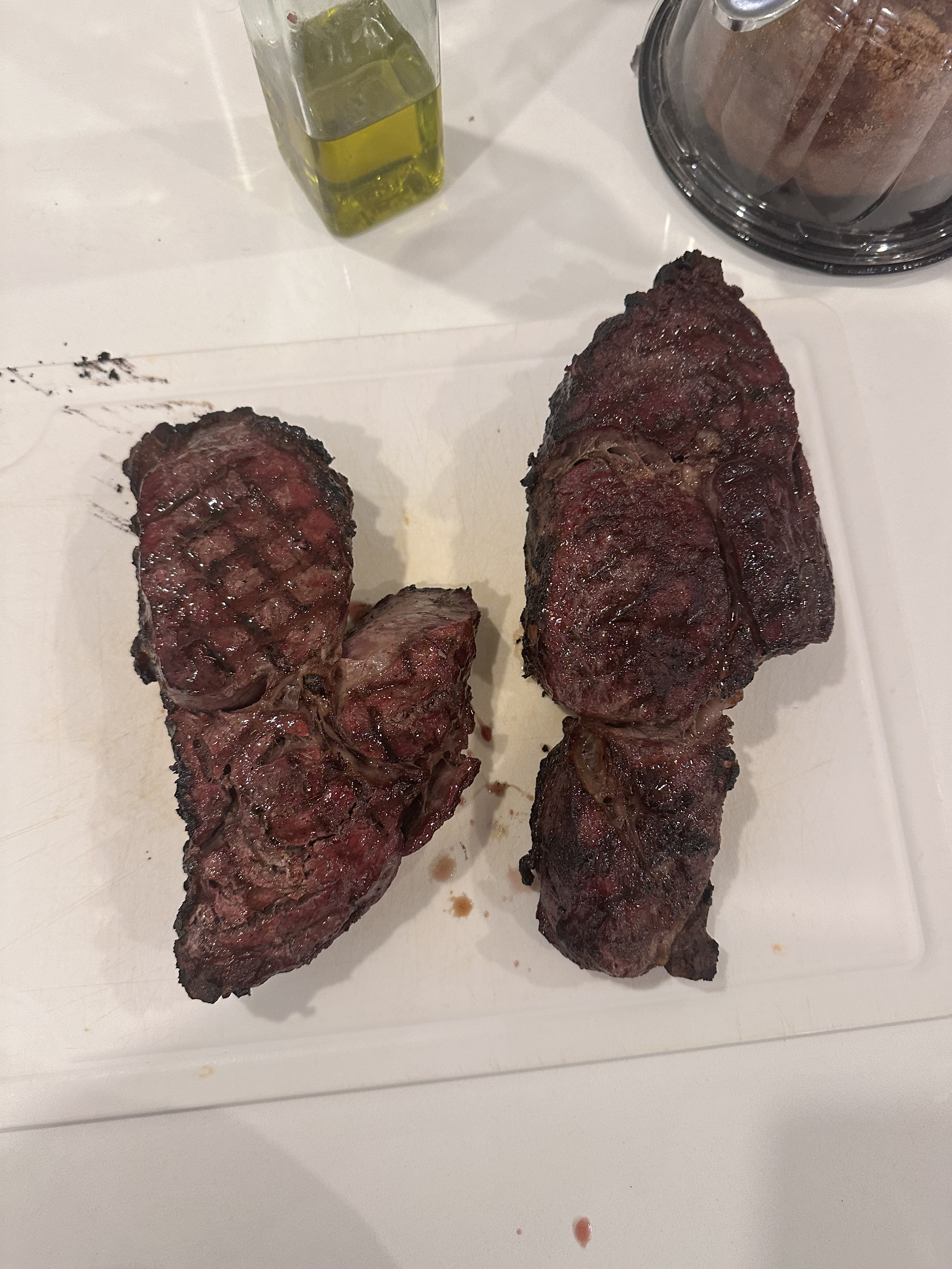 Had a botched 4 pound ribeye I bought I a Christmas time (that’s its own story, but it was free after a strongly worded email.) Gave the dog the bone and had some semi thawed steaks dry brining most the day. No smoke just salt. Just kinds grilled. After a rest and a slow roast.