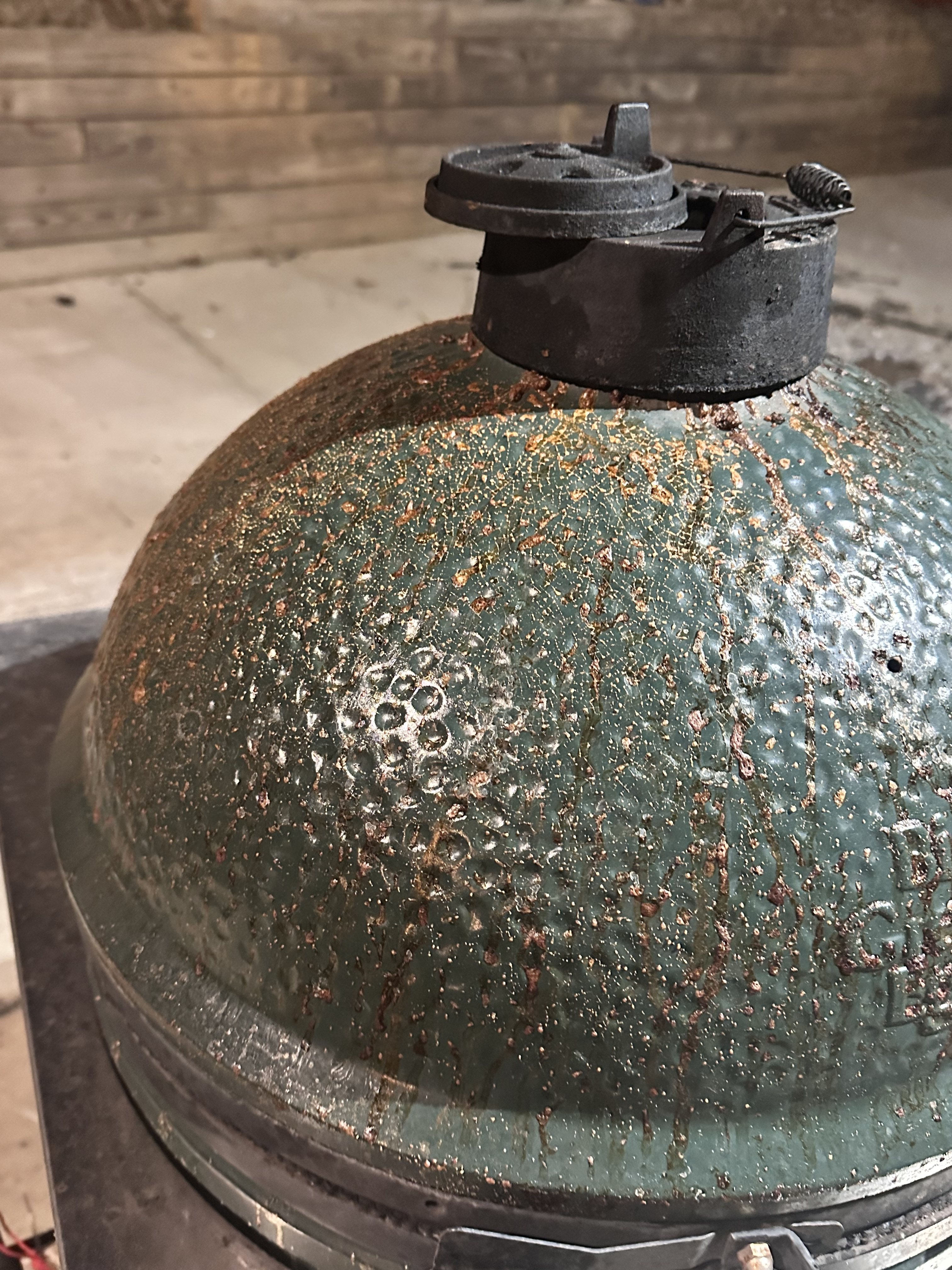 do that ind let rain really soak into the ceramic, the grease will steam from the inside out thru the ceramic. pretty much a given for my egg that lives thru mud season in maine. next hard rain will wash it off. i will light the egg when i get to the camp in the spring just to dry it out, wet ceramics take for ever to heat up and stop smoking so sometimes i plan a cook on saturday but just go through a drying process the night beforefukahwee maineyou can lead a fish to water but you can not make him drink it -