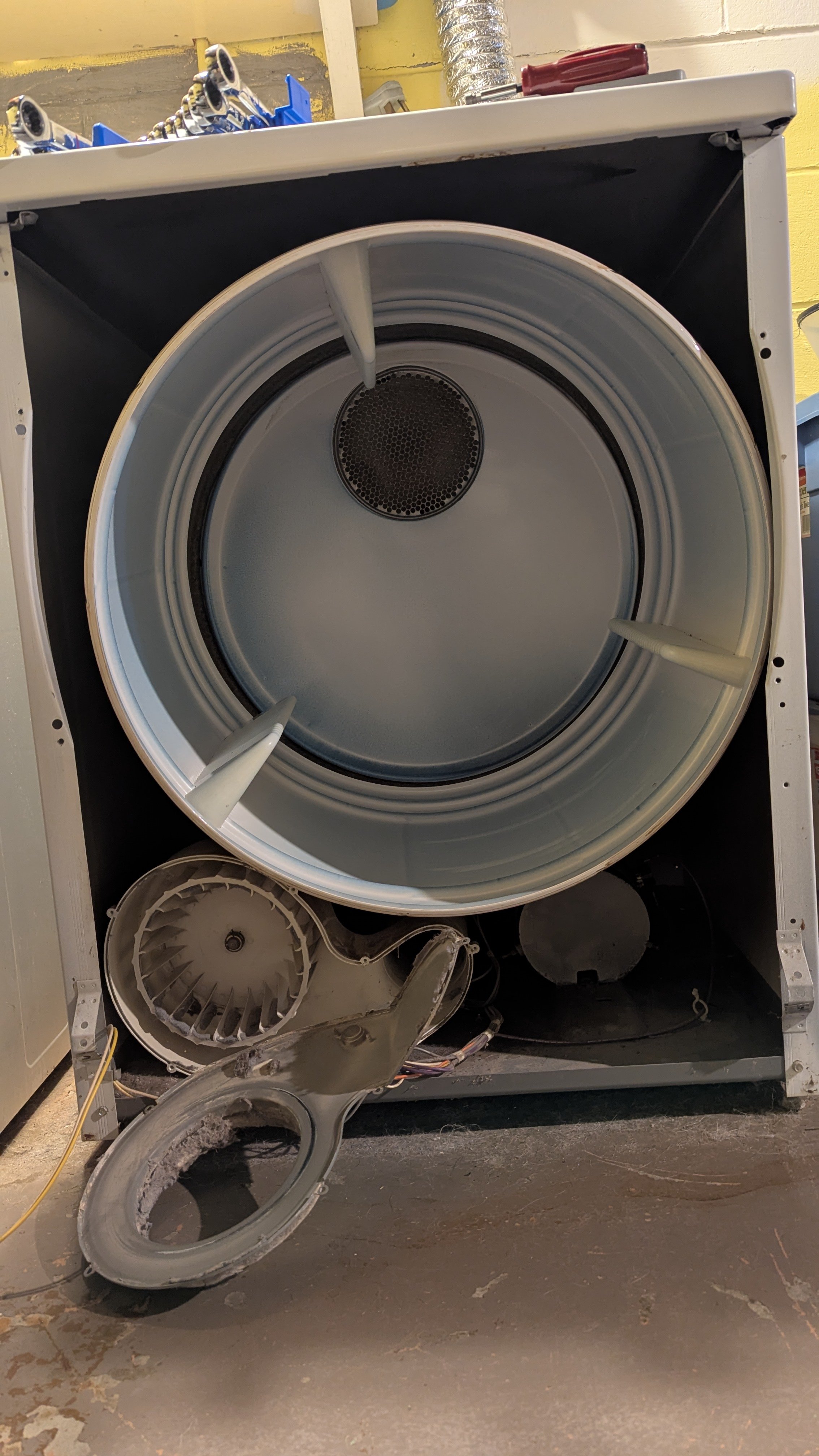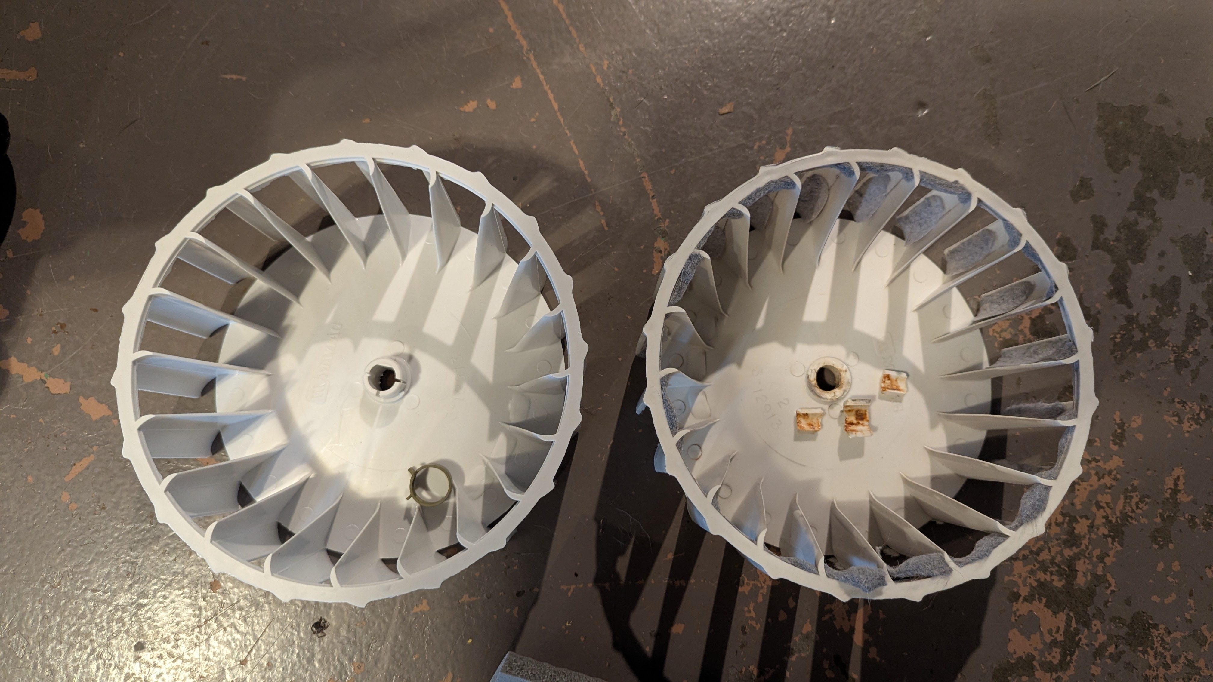 Blower wheel on my analog Maytag dryer is a plastic or nylon composition. Blower motor shaft is "D" shaped and made of steel. Every 5-7 years the shaft hole in wheel morphs to a "O" shape. When the dryer sounds like there is a pair of shoes inside it's time for a new wheel.