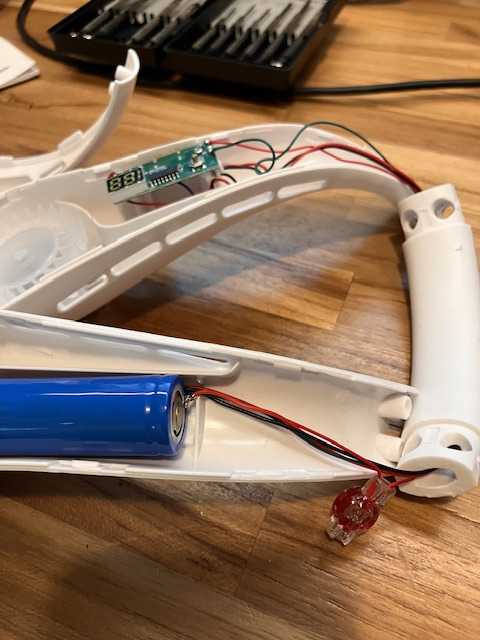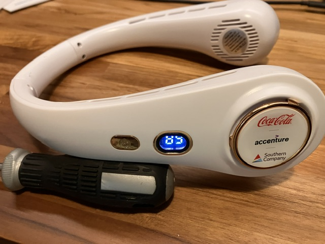 • a freebie cooling neck fan thing only worked on one side. the wire powering that side was clipped in two during assembly. must have been just before quitting time at the plant in Cupertino!!! easy fix and utility for a while instead of straight to the landfill.
