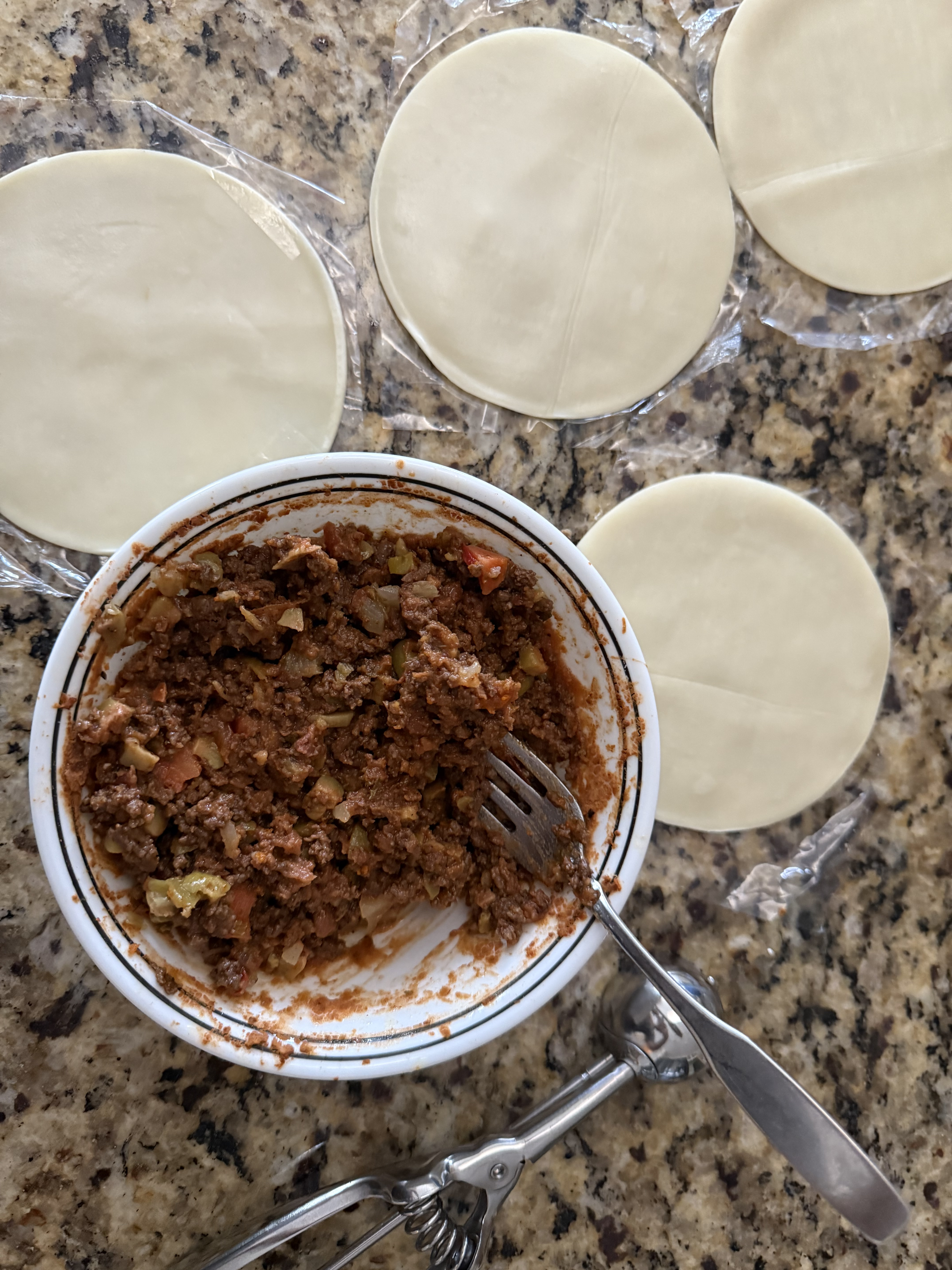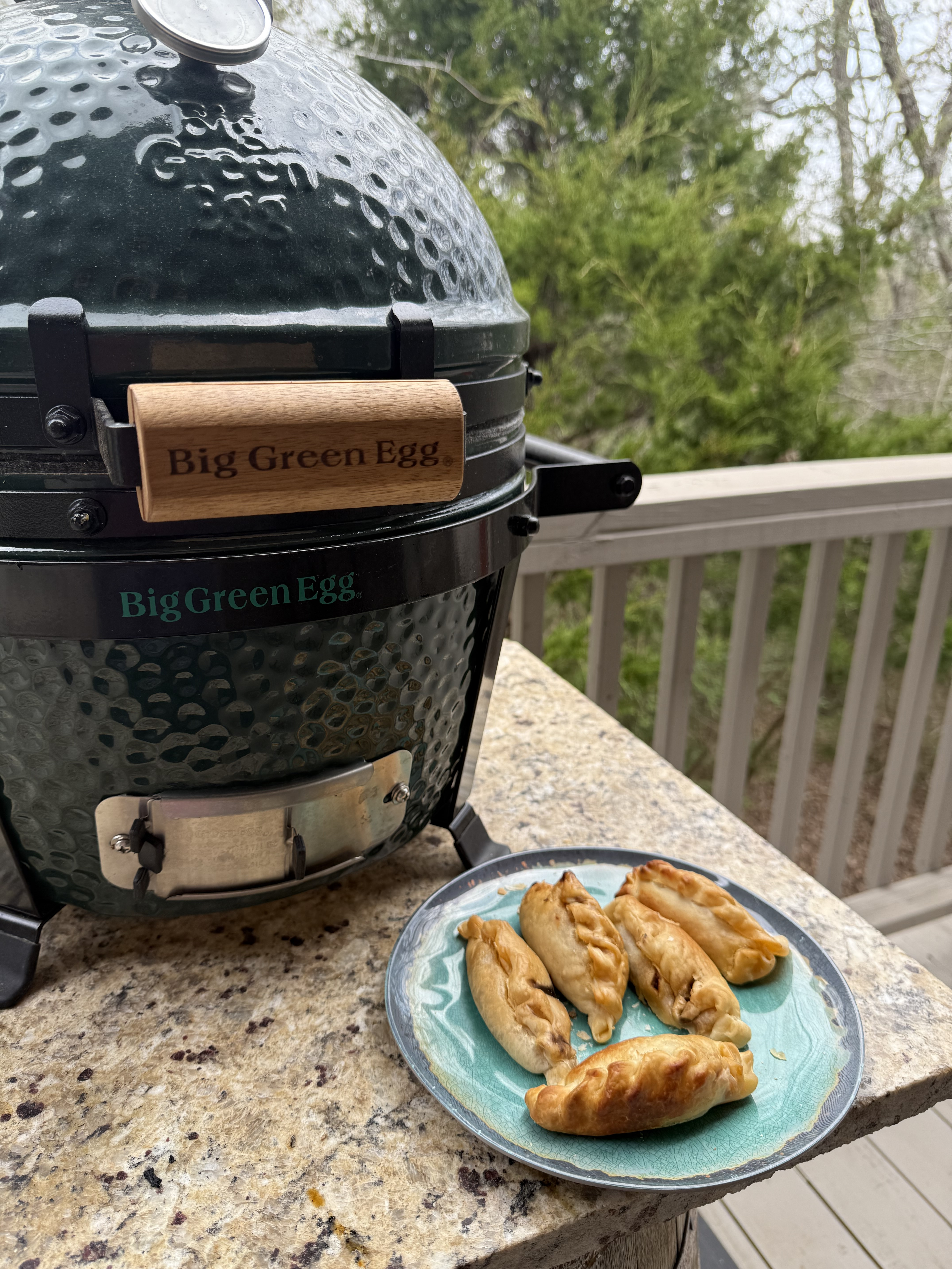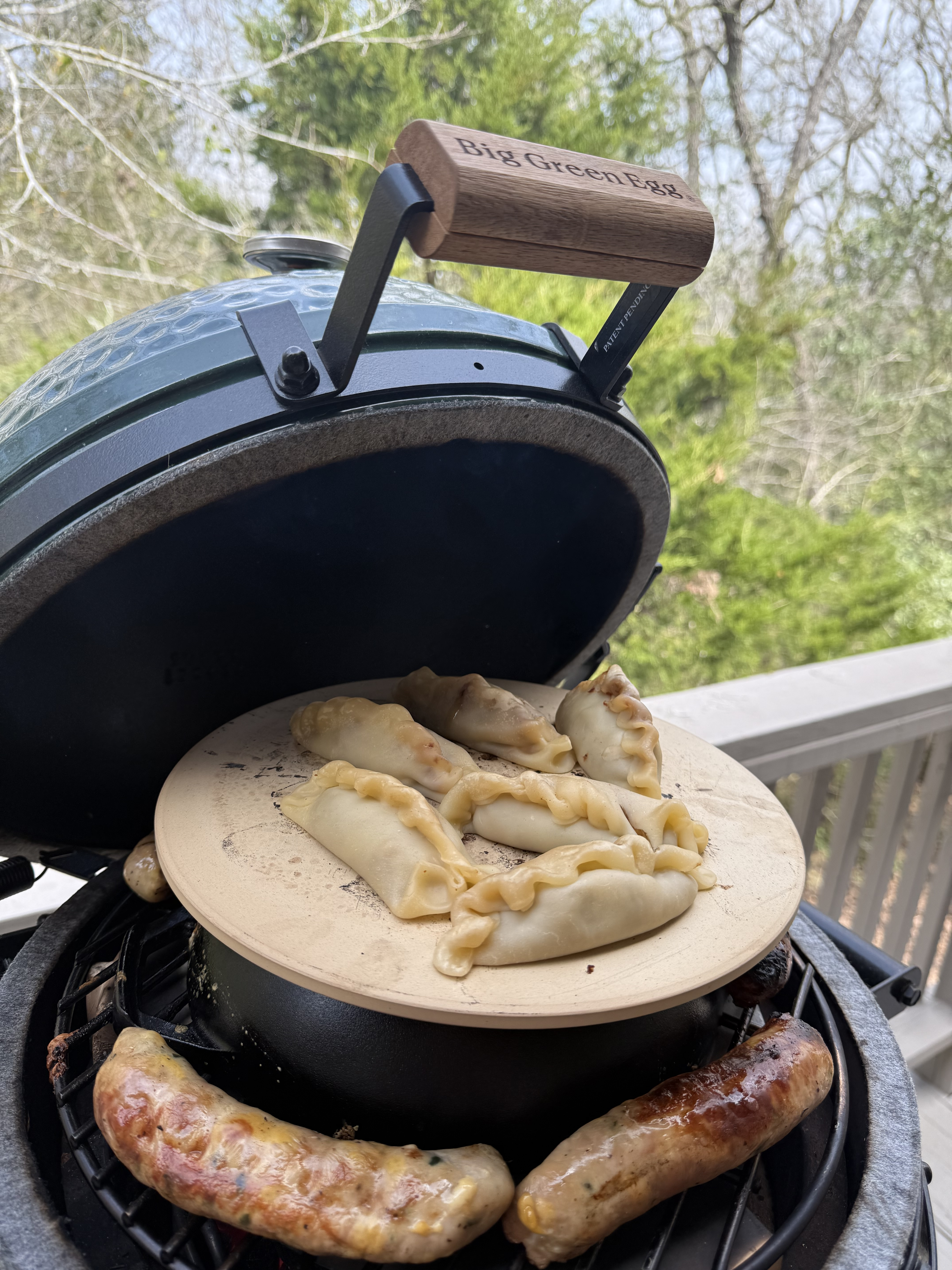I had so many business dinners this week that DH fended for himself with his standard of tacos every night. Checking out the leftovers in the fridge this morning I decided to mix up his leftover taco beef and refried beans and add some chopped green olives and some extra nutmeg and cumin. Cross between an empanada and a Jamaican meat pie (although this sentence just made an abuela cry somewhere). Used premade Goya shells for baking (so lazy). Set the deflector legs down with the grate on top and a cast iron wok inverted on that and a 10inch pizza stone on the wok and heated to 450. Was able to cook some chicken/cheese/poblano sausages around the edge of the wok. Not ideal sausage cooking conditions but it got done.