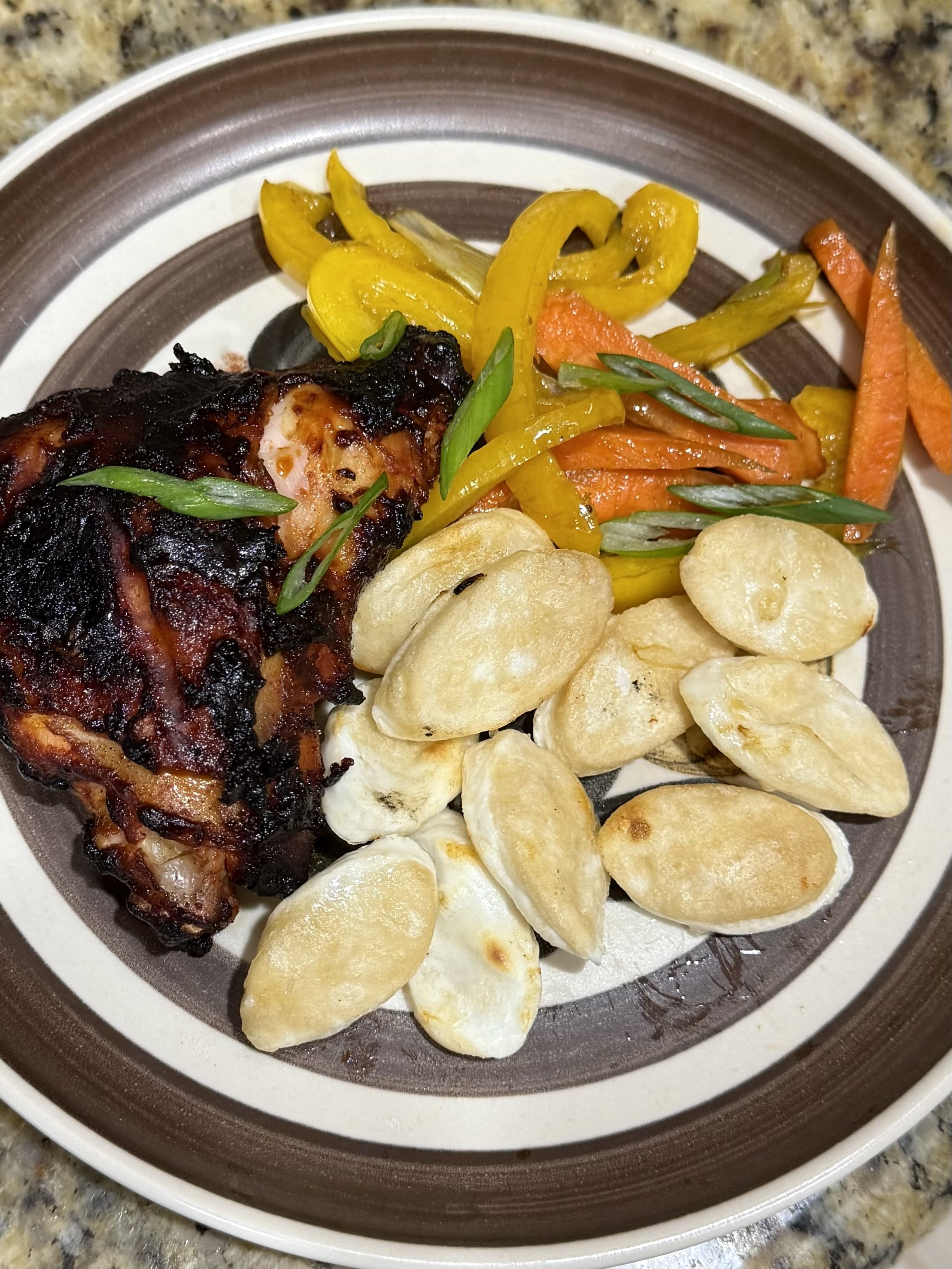 DH loves Korean food, so today I cranked up the XL and added some soaked apple wood chunks just outside the fire zone before setting the deflector on top. Also roasted some beets and smoked some chicken breast for later this week… I can’t help but use the space. Set at 250° for two hours followed by a 475° sear at the end for 30min that allowed for a quick stir-fry. Cooked the rice cakes (his fave are pictured) on the stove top to maintain the few hairs remaining on my forearms. “Korean” marinade on the chicken Included a smashed clove of garlic, about a quarter teaspoon of red chili flakes and a quarter cup of citrus ponzu and 1/2 cup of Korean red chili paste (pictured here). Not pictured is the generous hunk of kimchi served with lunch