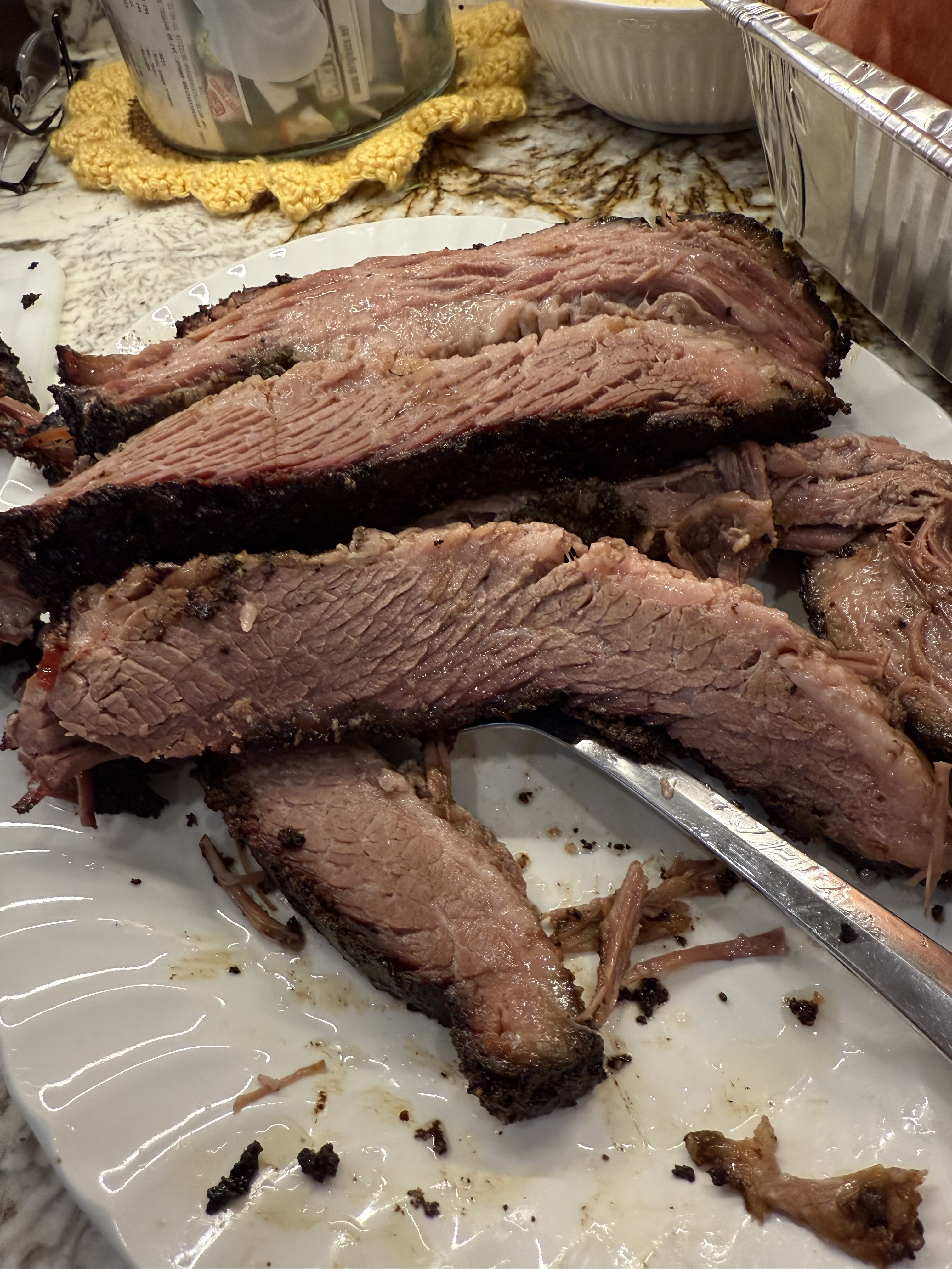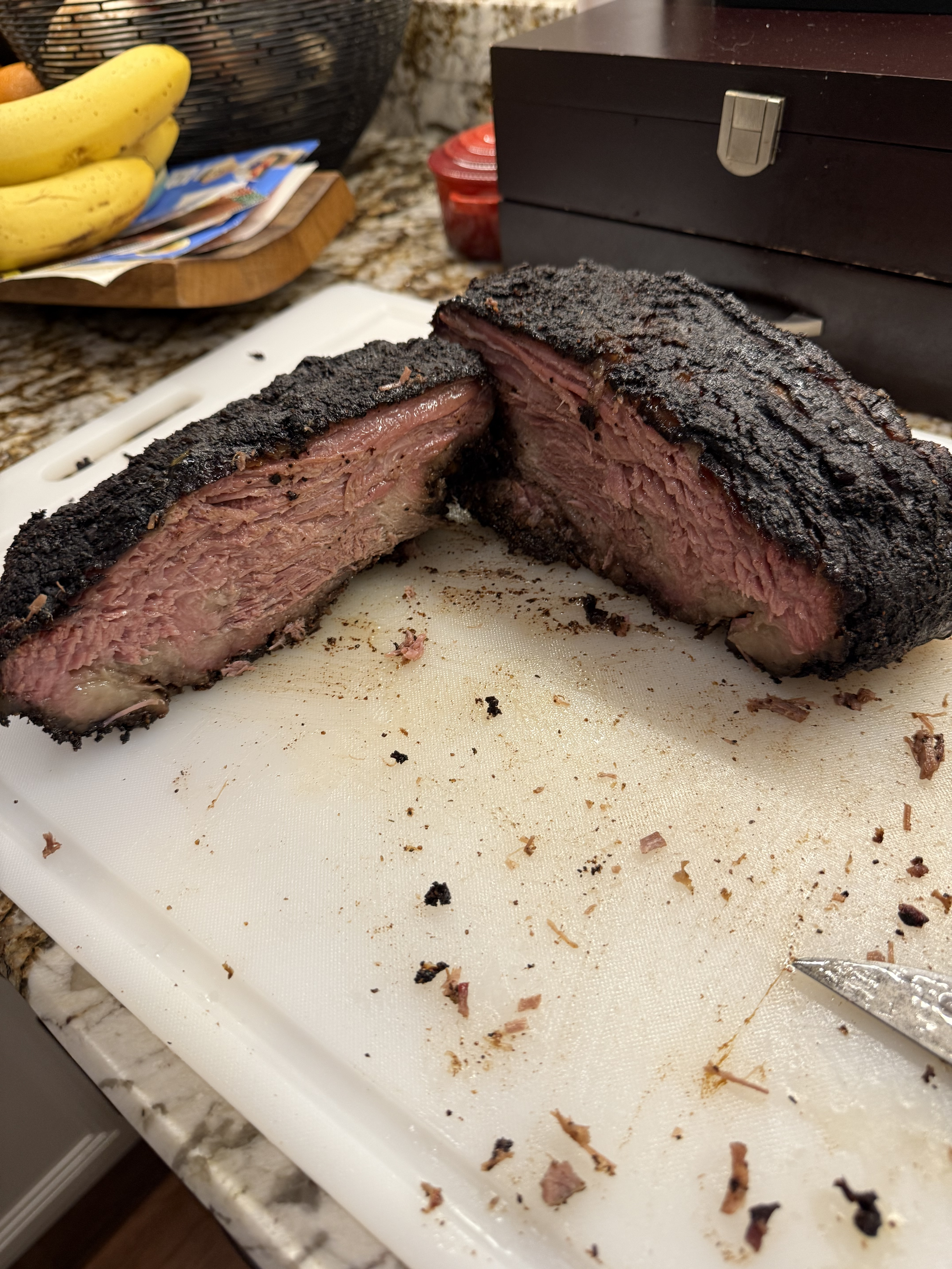 I think it turned out pretty darnn good, (and I do recommend the Penzy’s beef stock rubbed on as a base) considering 19 hours on the XL. We stuck it in a yeti, wrapped in butcher paper, in an aluminum foil pan, covered by another aluminum foil pan then jammed every towel I could find over it, we let it rest for several hours fat side up, after cooking fat side down. It still showed steam when sliced.