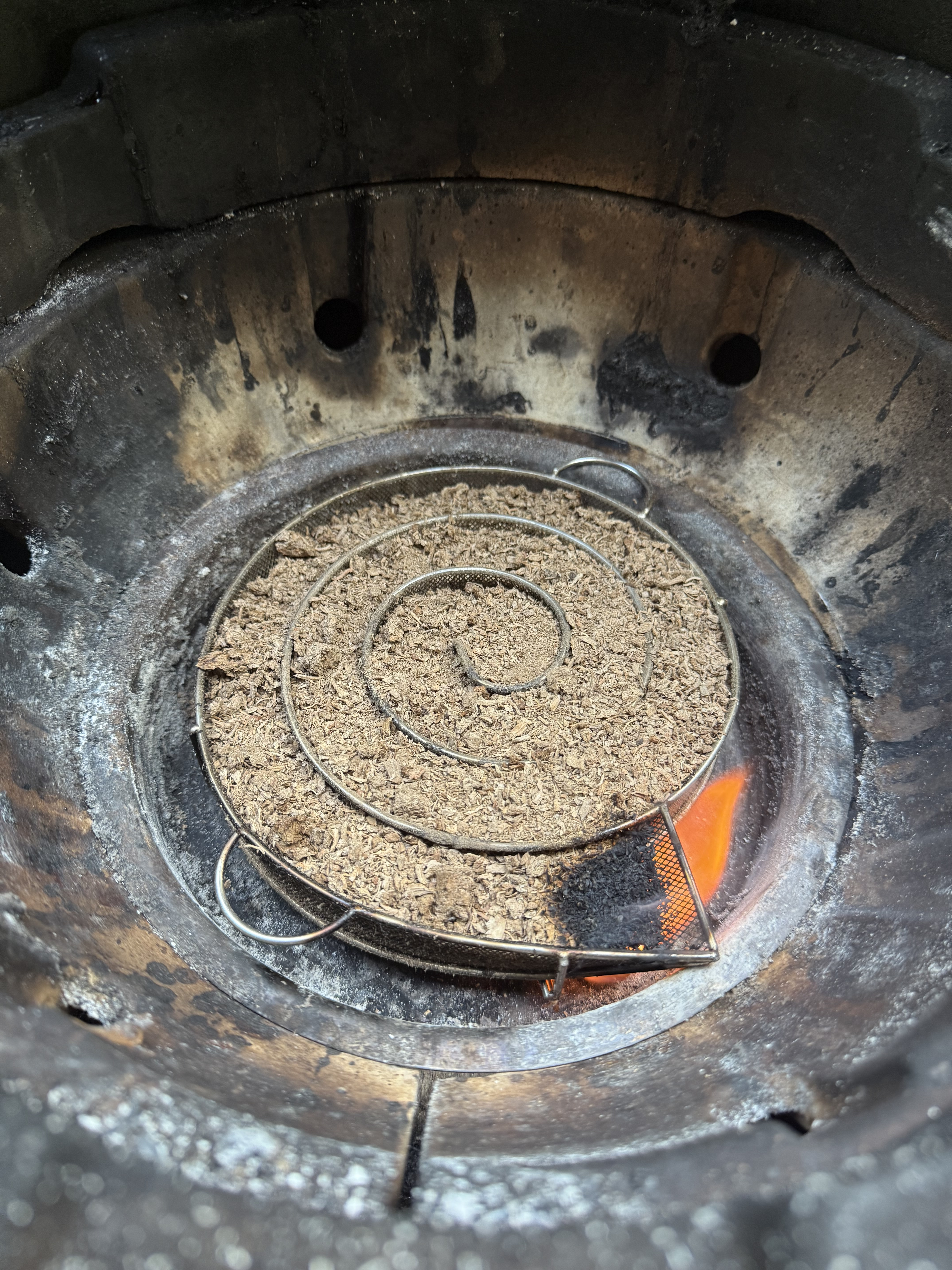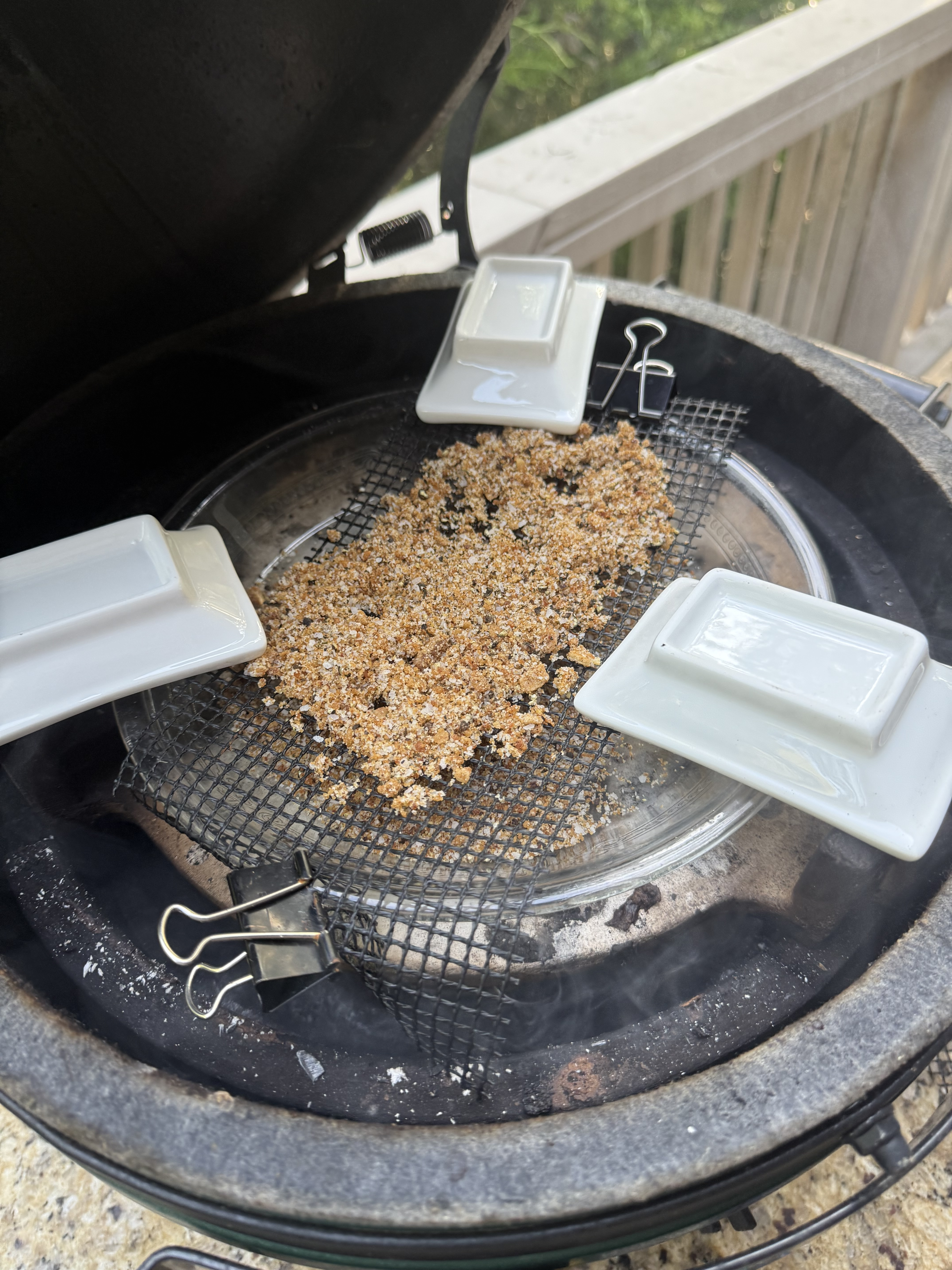Looked at several old forum posts and several recipes online and decided to give this a try. Last weekend my grapevine cooking friend made us steaks for lunch. What I neglected to mention is he smoked a couple pounds of brisket fat trimmings with two broken up heads of garlic and a big handful of rosemary at 350° in a CI Dutch oven, this ended up frying the garlic into crispy chips. He then poached the steaks in the oil at 160° on the smoker followed by a CI sear (excellent steaks). Long story longer, as we were cleaning up we decided to make garlic rosemary salt with the leftovers. It is amazing and reminds me of a smoked rub I have had. So this morning I added a load of corse black pepper to the mix and set up the MM to cold smoke with apple and oak sawdust. Didn’t think it through enough and ended up needing to use three sushi dipping bowls to elevate the rack above the garlic salt mix so I can try smoking regular Maldon sea salt flakes in the same cook. Used my grill mesh to elevate the salt above glass pie plates to avoid cross contamination. Hope this isn’t just a huge mess to clean up this afternoon!