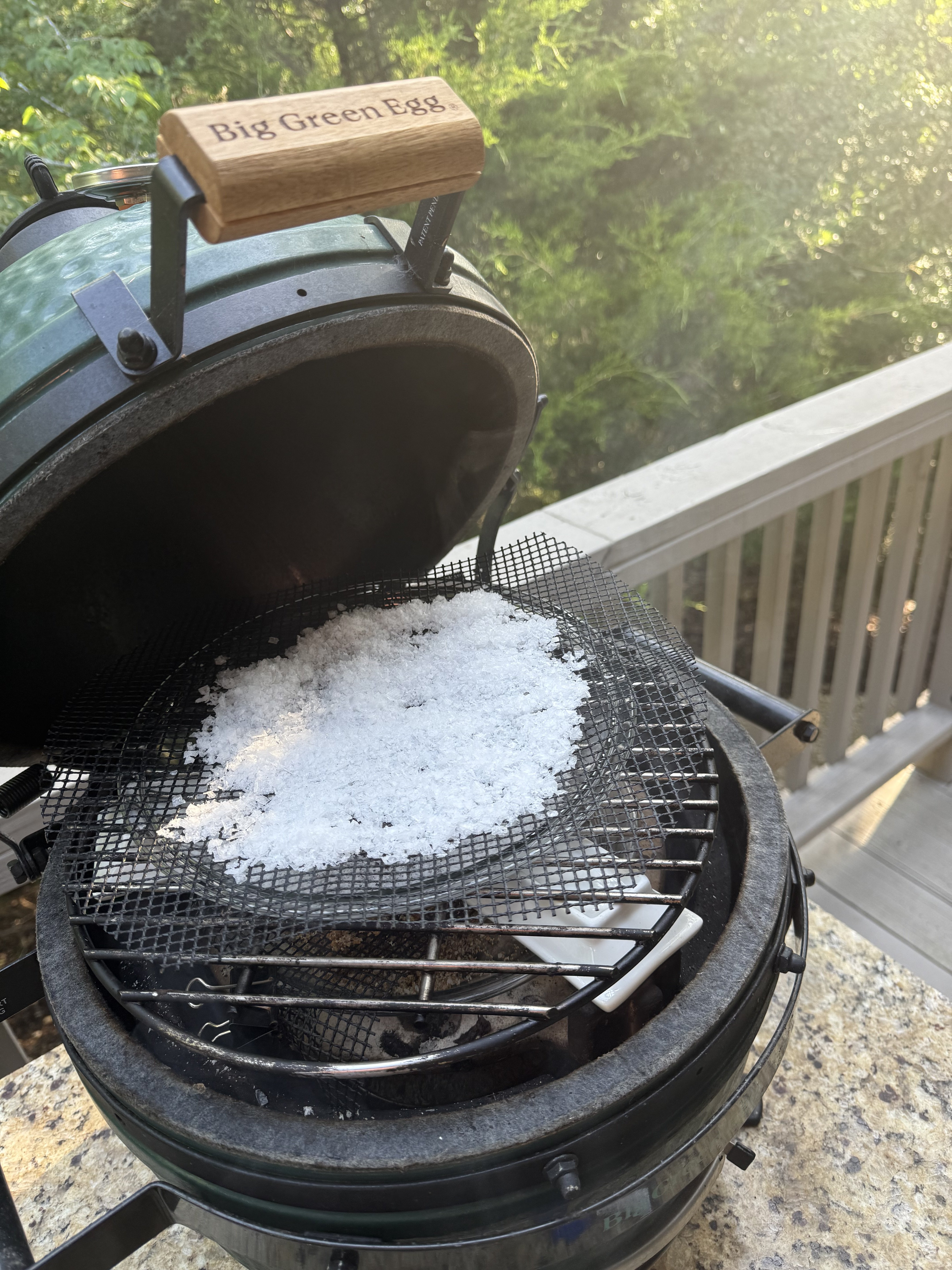 I use a mesh pan suspended over an aluminum pan to catch the drop throughs. Shake every 30 minutes or so. Longer the better.We mainly use it as a finishing salt, or I frequently plate dishes by doing a quick grind on the plate first, then the food.Large BGE and Medium BGE