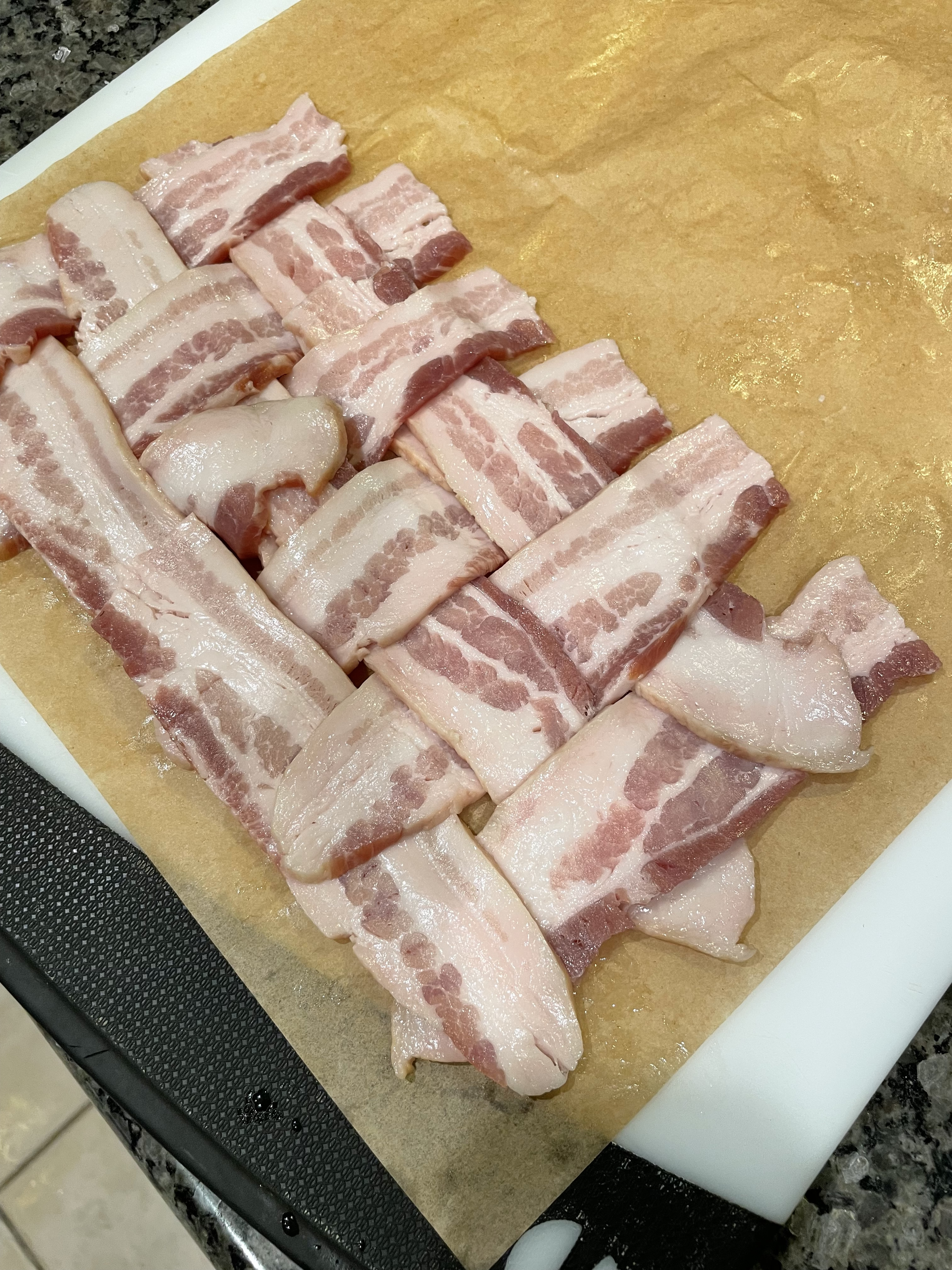 Didn’t have enough bacon for a full weave. So made do with what I had. Blew caliprince’s mind that there was such a thing as a bacon weave!