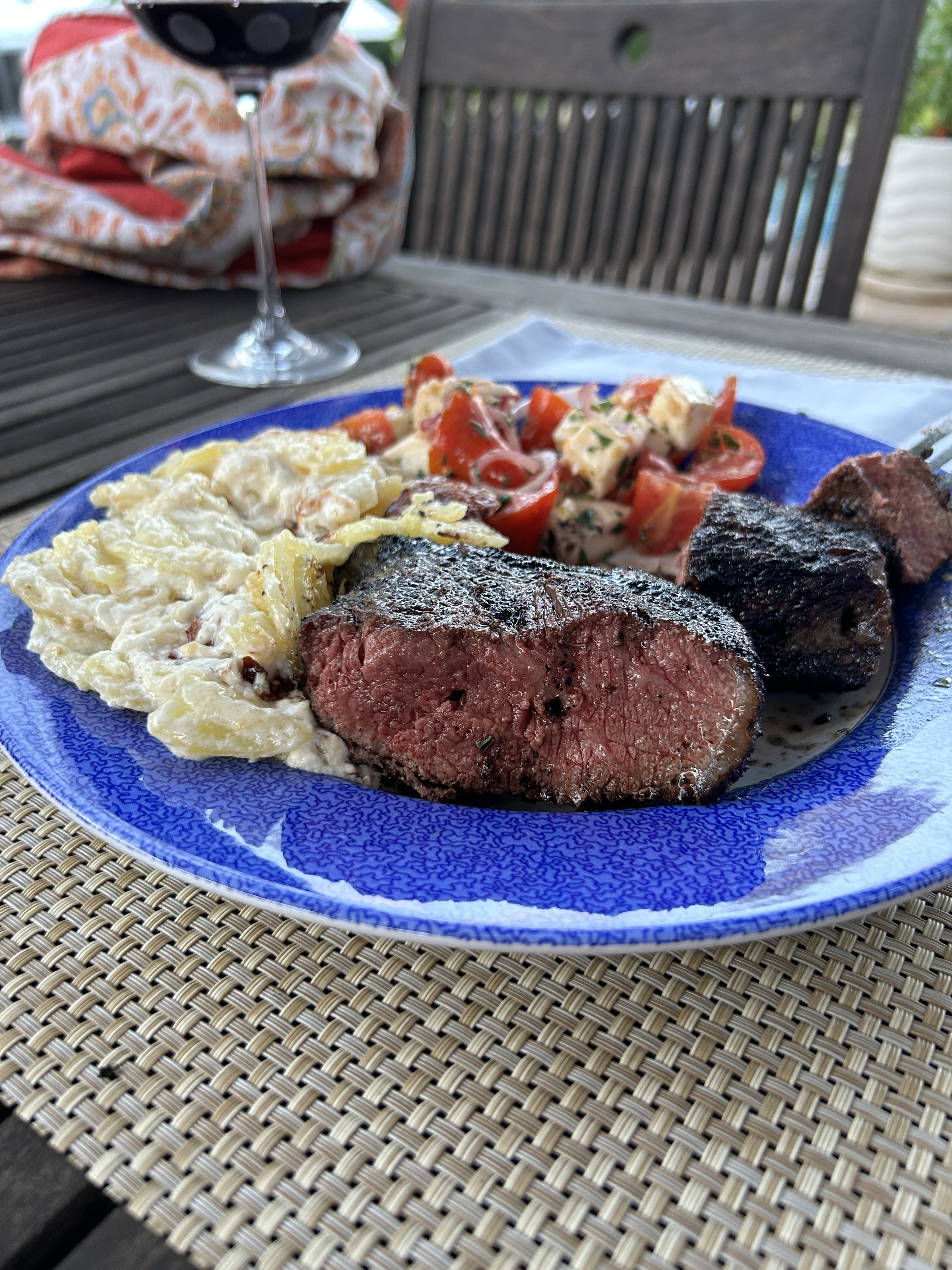 Our hosts provide the sides - the best potatoes au gratin I've ever tasted, panzanella with tomatoes from their garden, and homemade fruit sorbet. It is often the best meal I eat all year, and this year was up to our usual standards. We started with a cabernet and moved to a pinotage as dinner was served.
