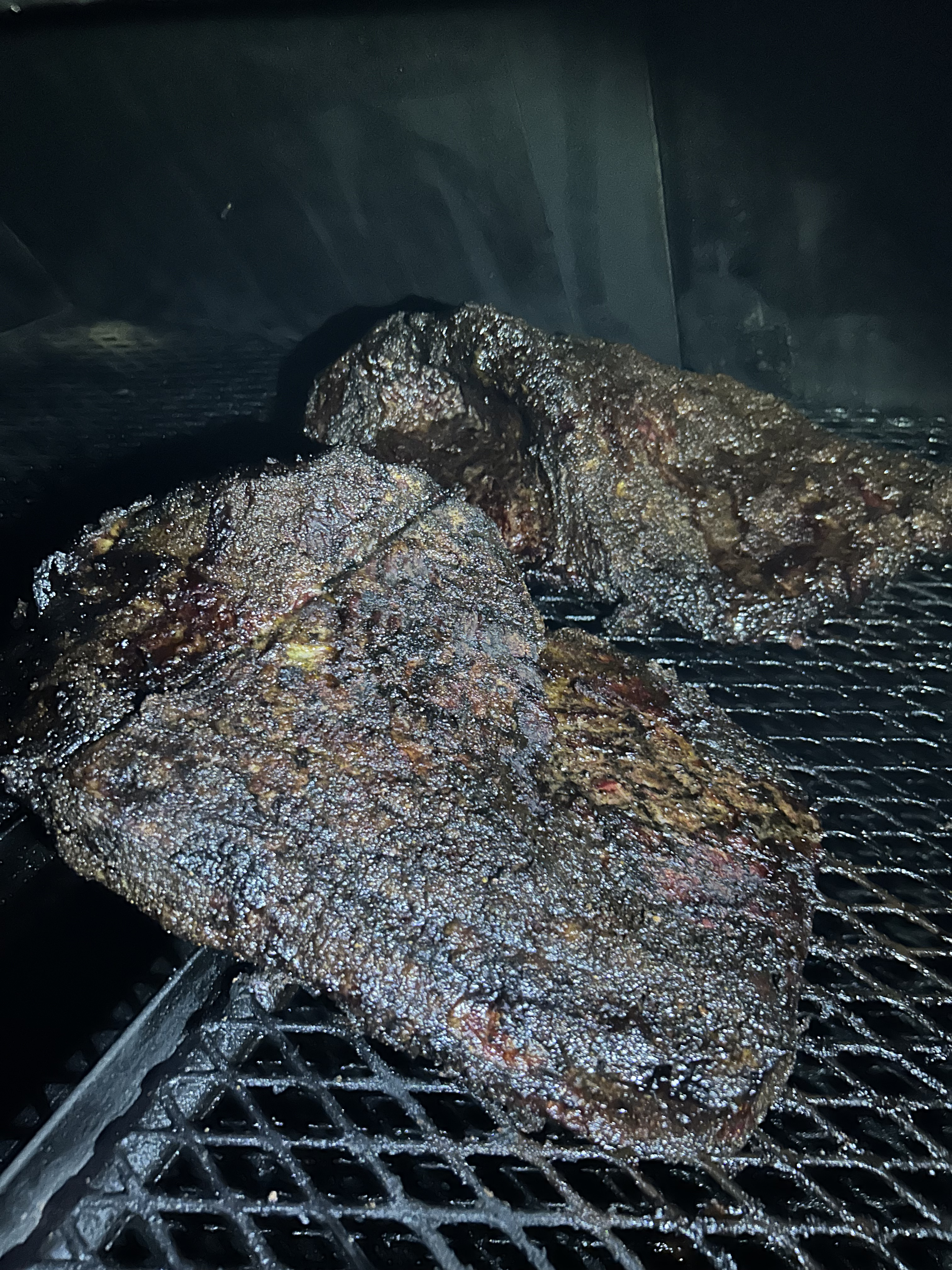 I love the smell of brisket in the morning. They’re coming along nicely. Probing between 165 and 174. We have 3 that were over 22 pounds before trimming and 1 that was 13.4 lbs before it was trimmed. We put the smaller one on the lower shelf where the air temps are lower and that seems to have worked as it is within a few degrees of the larger ones on the top cooking grate.