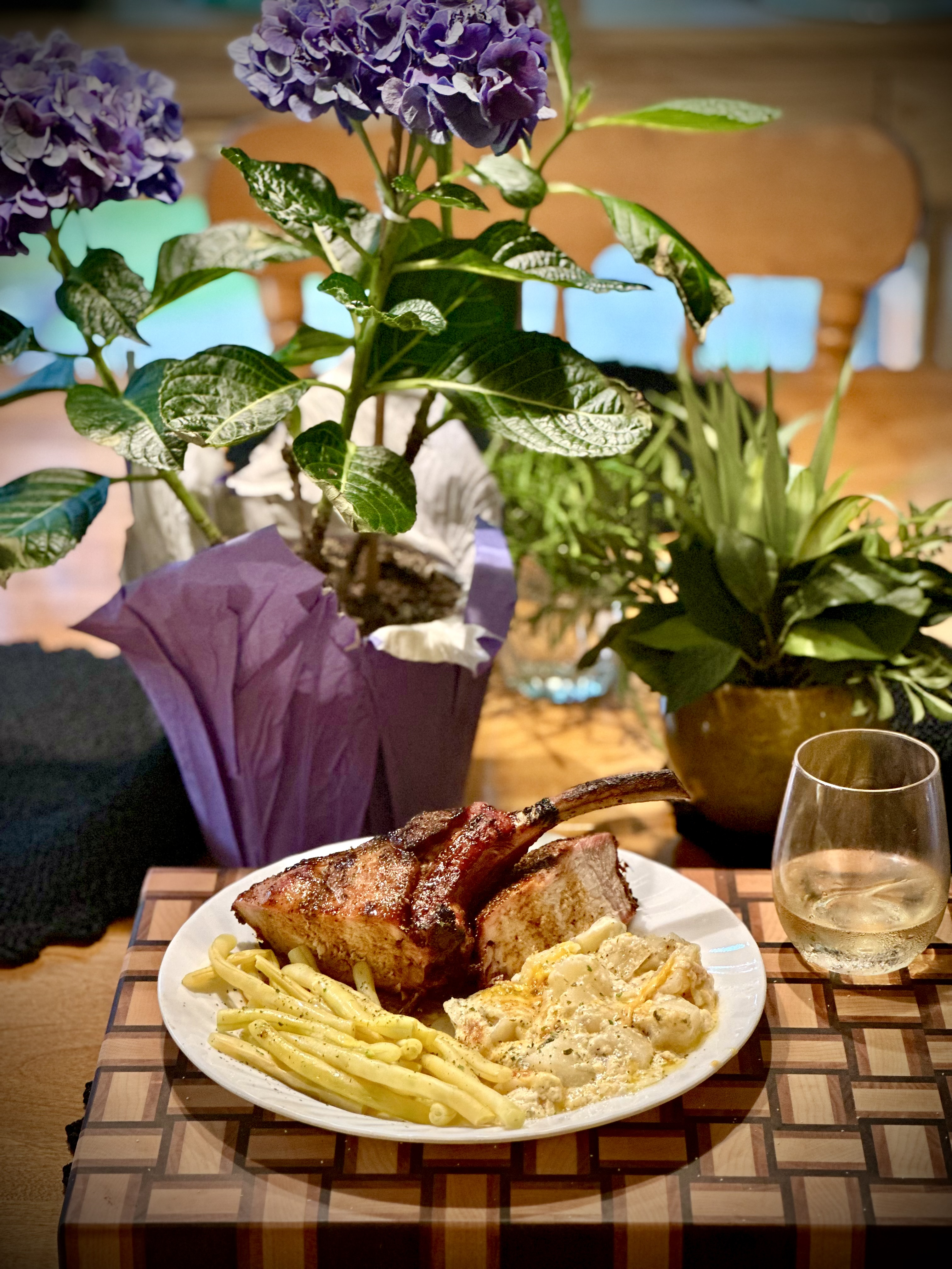 Anothe delicious tomahawk pork chop with fresh sourdough bagette’s, new beans and scalloped potatoes